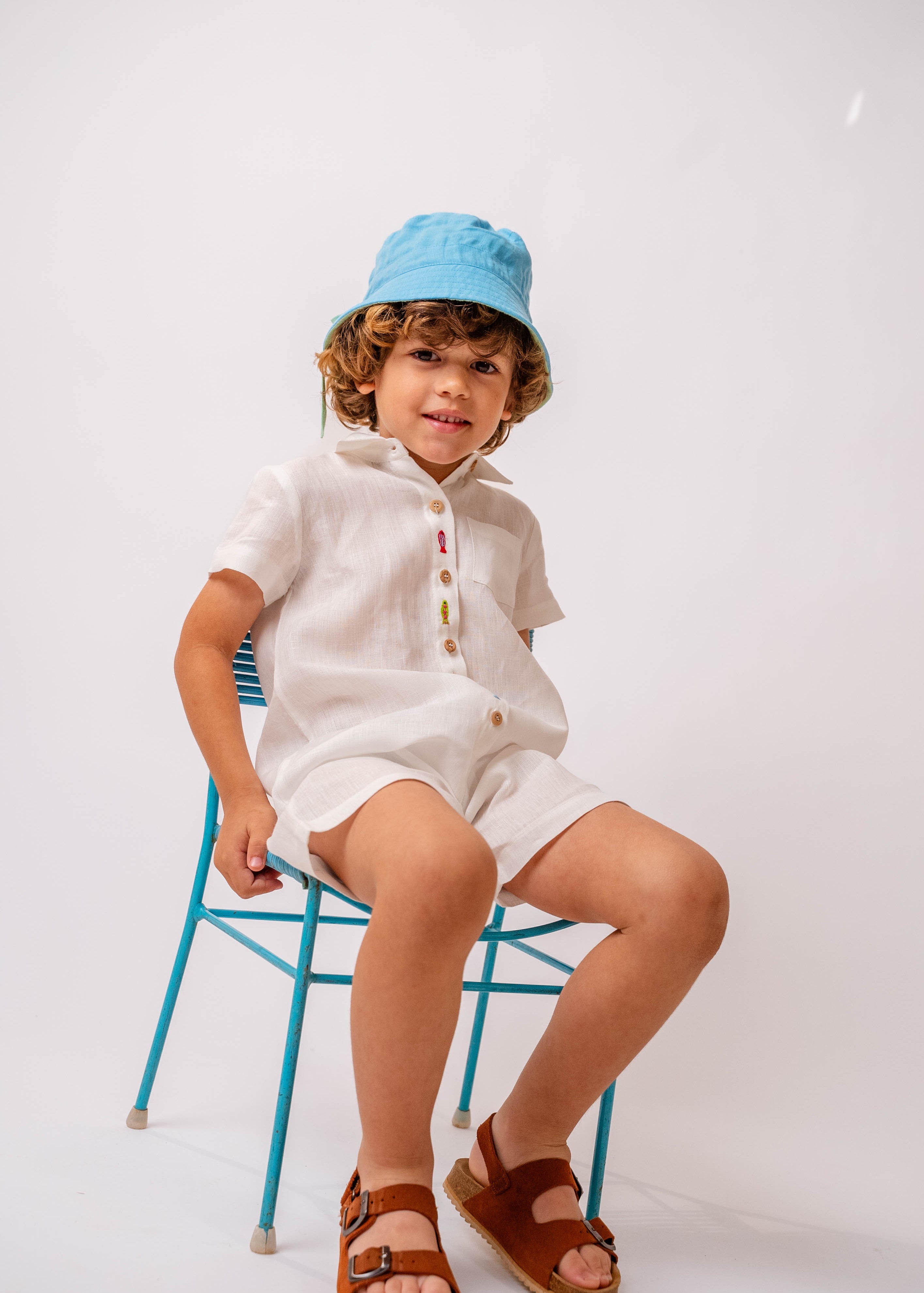 Macaquinho Kalu Infantil em Linho Gelo e Bolsos Coloridos