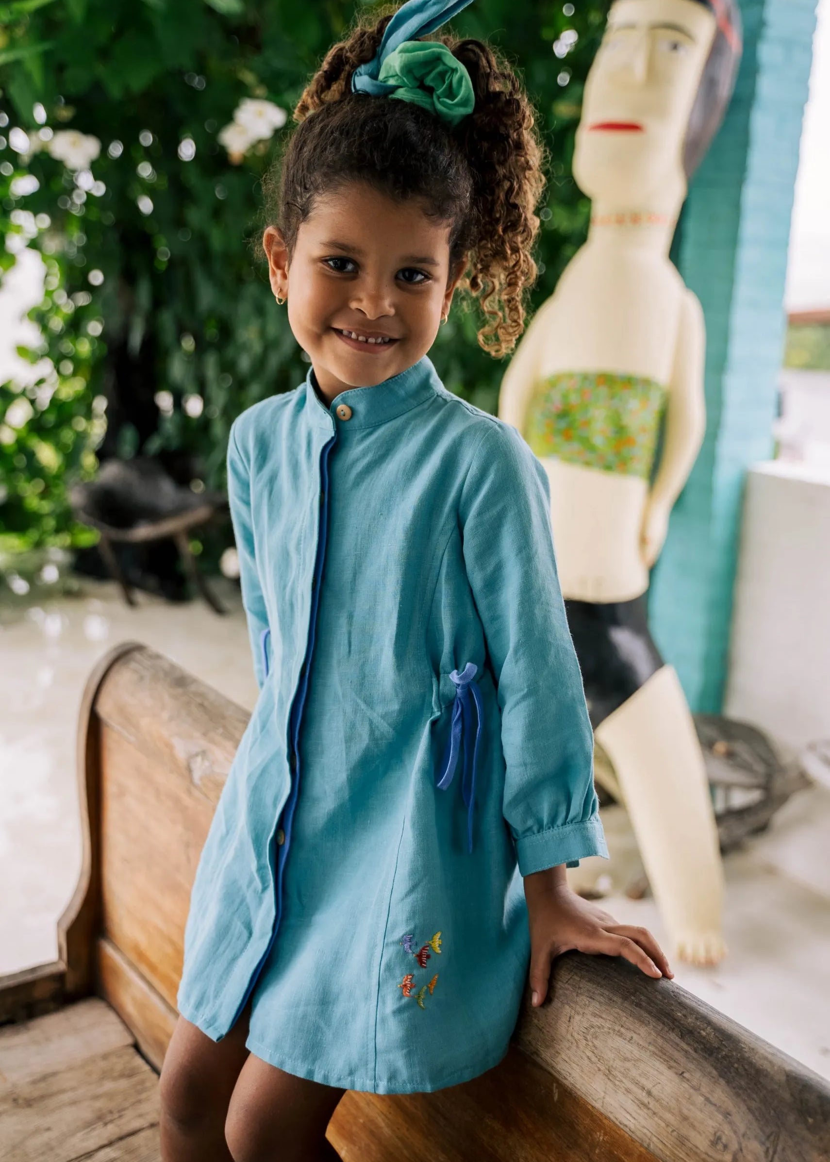 Macaquinho Tiê Infantil em Linho Bicolor Azul com Bordado de Cardume