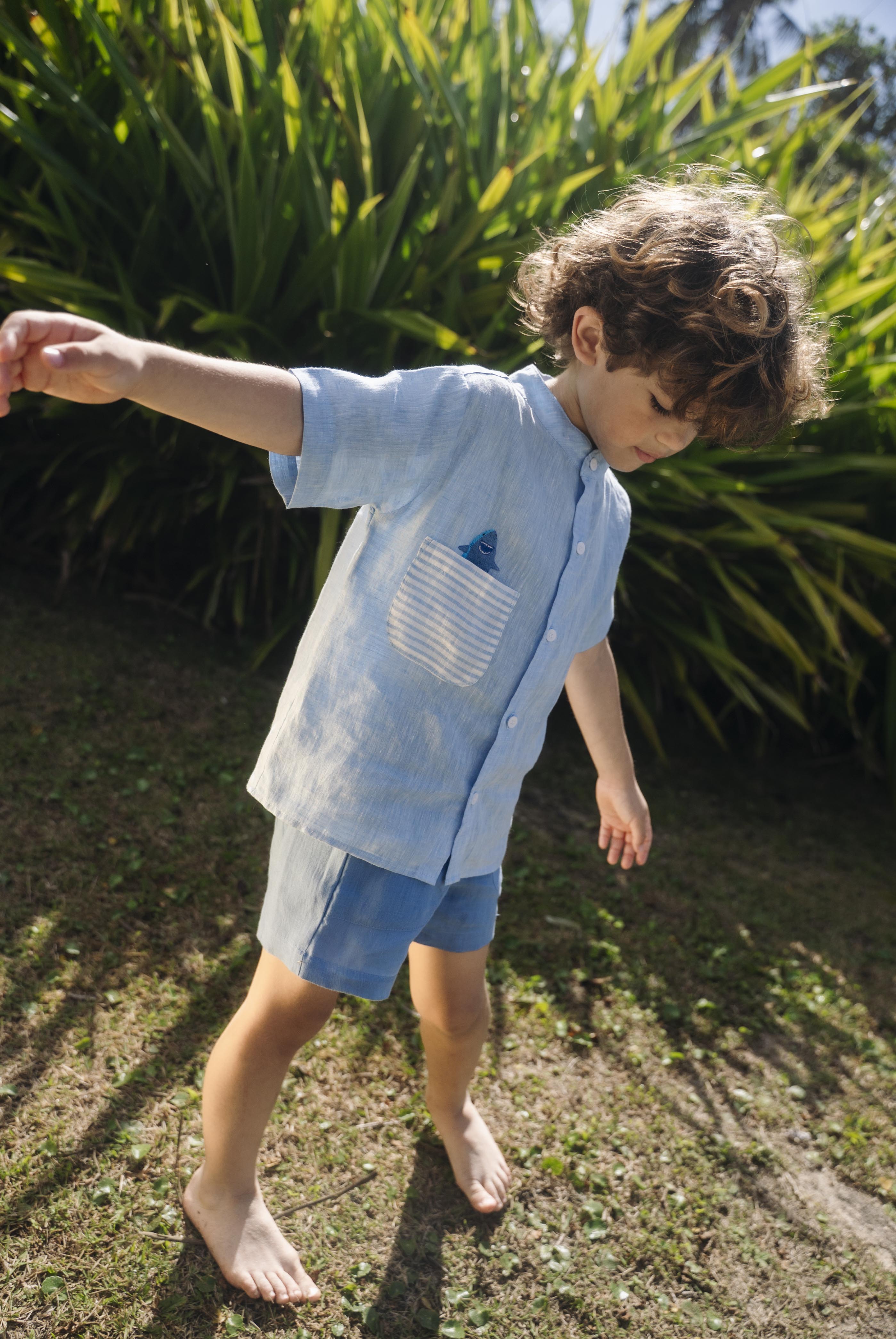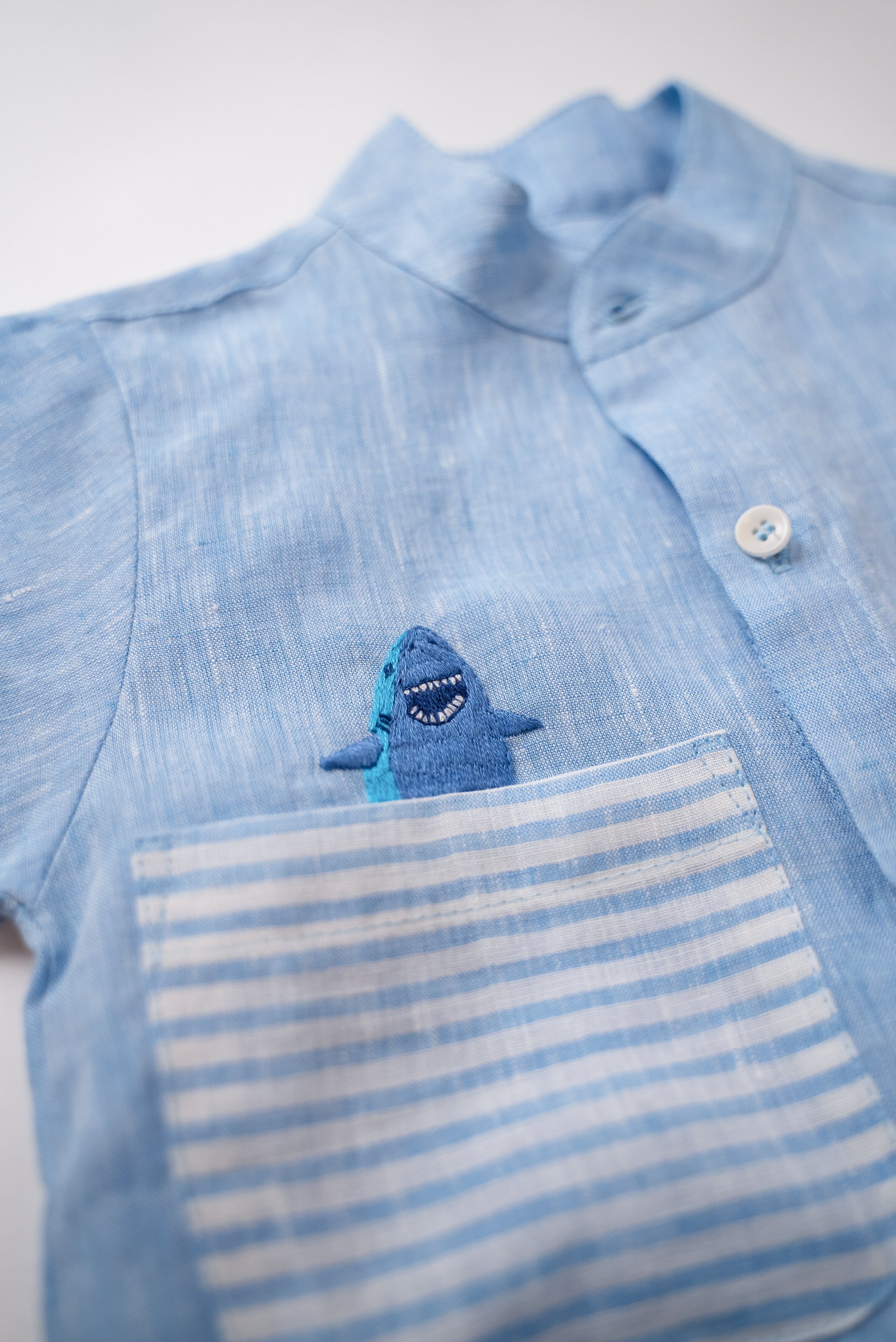 Camisa de manga curta com caimento leve, garantindo frescor para meninos e meninas. O destaque é o bolso listrado que lembra um mar calmo: as linhas sugerem ondas e, na superfície, surge um tubarão bordado à mão à espreita, trazendo humor e poesia do mar. Gola padre, botões claros e acabamento caprichado completam a peça.