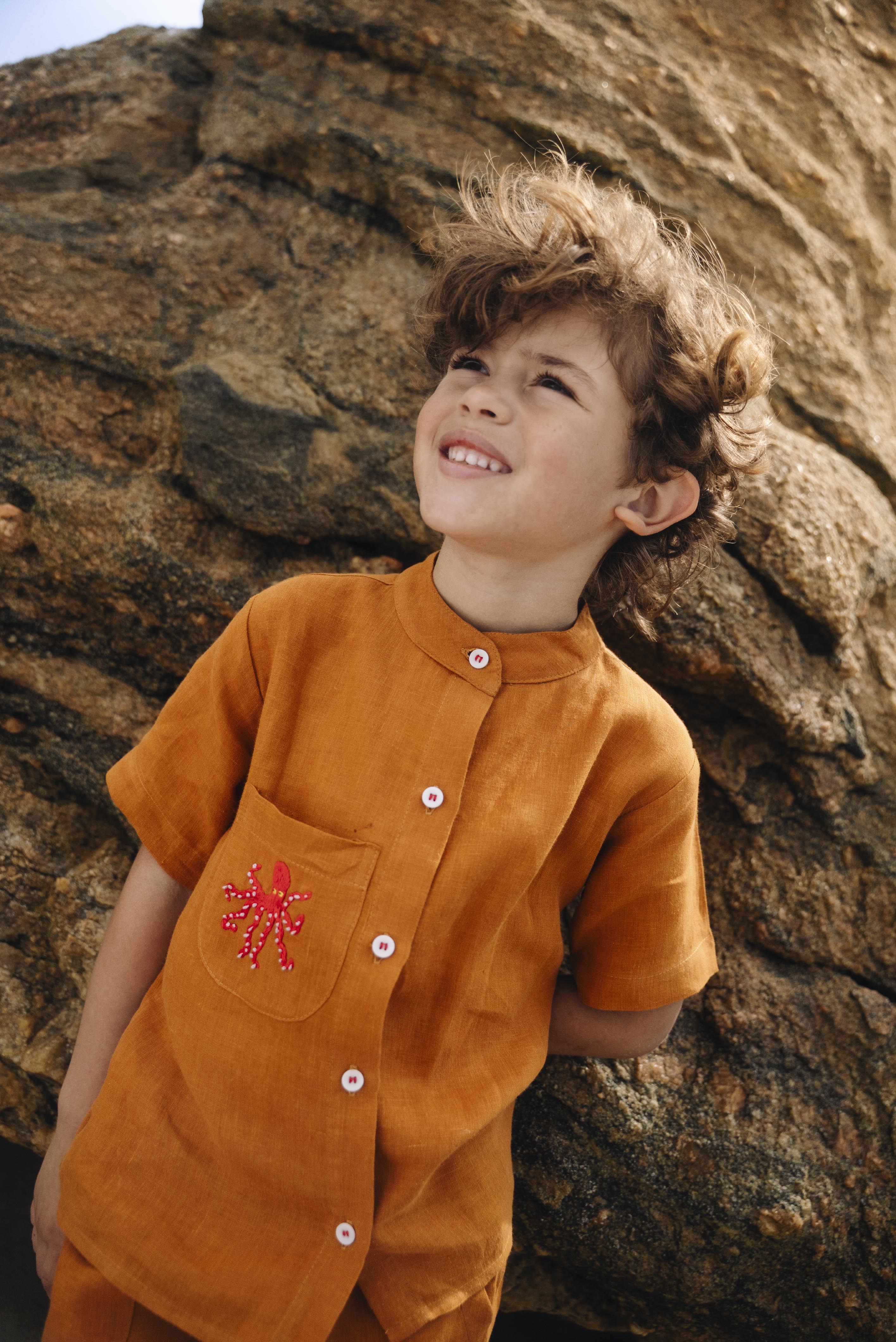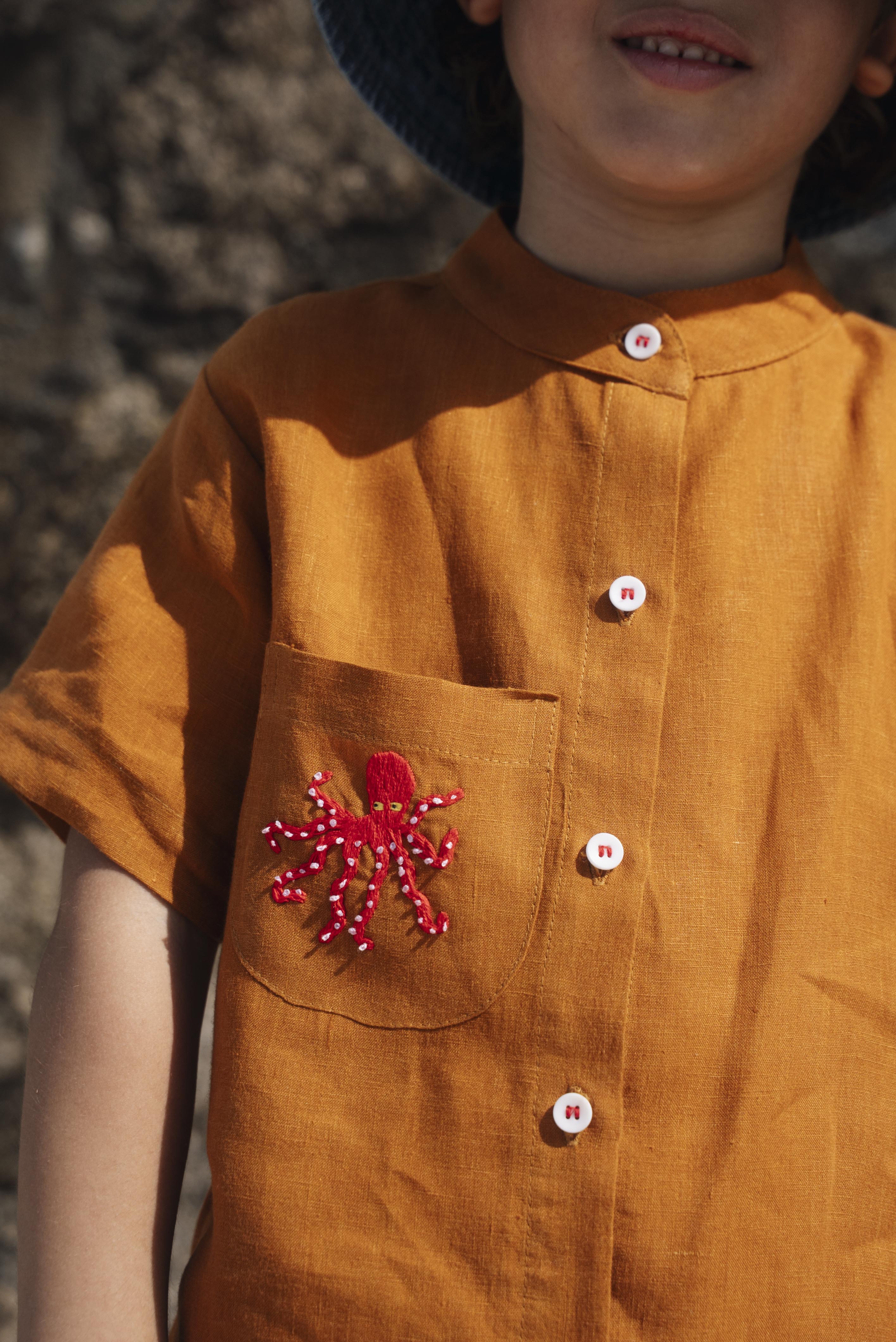 Feita em linho puro, essa camisa de manga curta traz o frescor e a sofisticação que a infância merece. O tom terracota aquece o visual com personalidade, enquanto o bordado à mão de um simpático polvo no bolso adiciona um toque lúdico e artesanal. A gola padre e os botões brancos com linha vermelha dialogando com o tom do bordado completam o charme da peça.