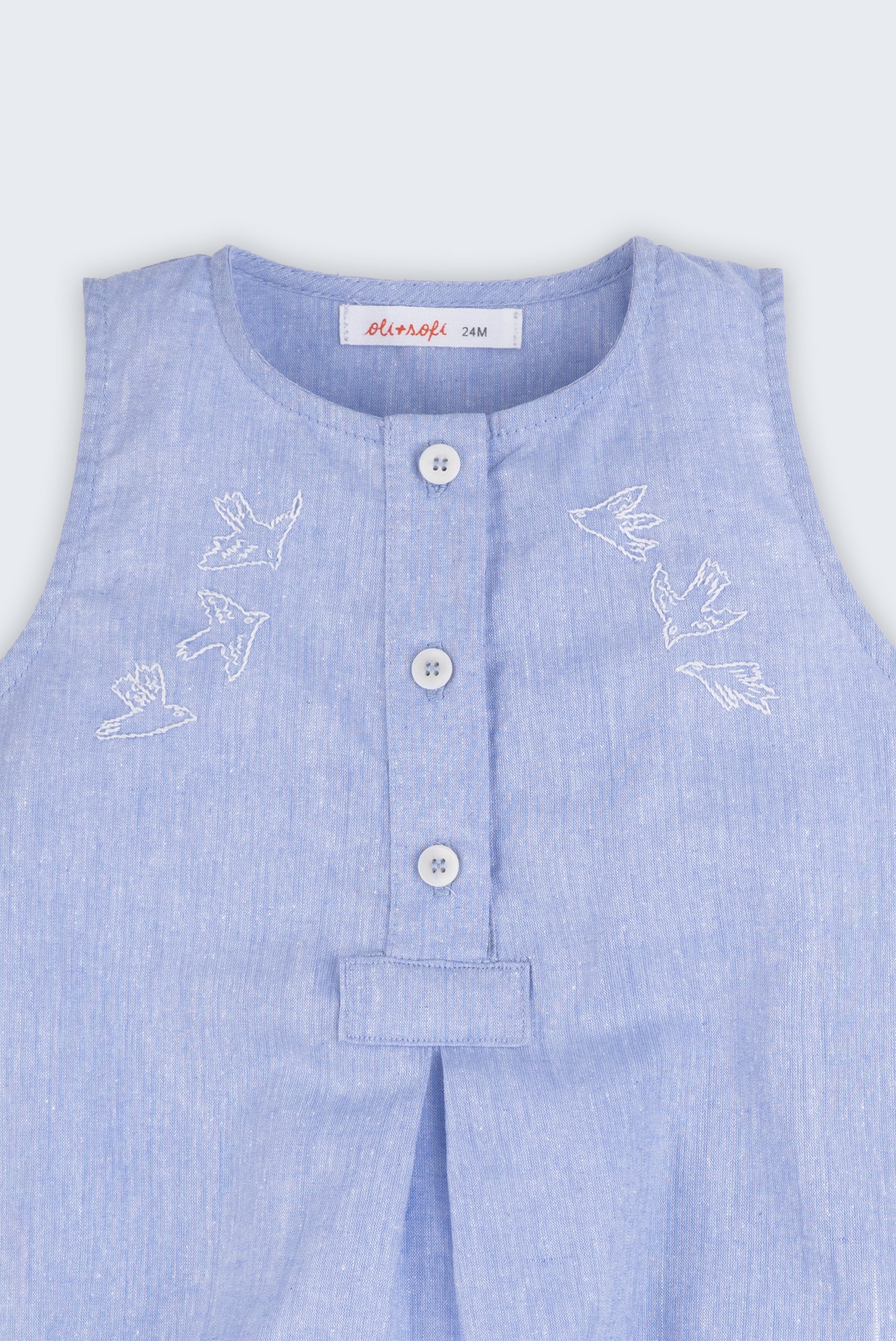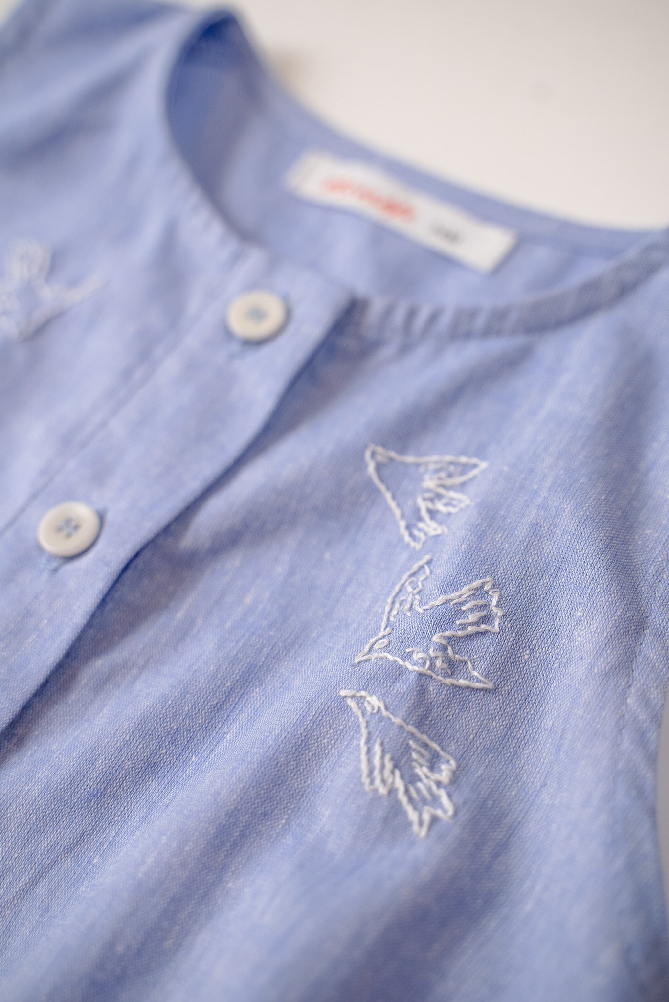 De toque macio e caimento leve, o macaquinho Valen tem modelagem ampla e confortável. O modelo conta com abertura frontal com botões e pregas sutis, além de acabamento elástico nas pernas que garante movimento sem apertar. O detalhe especial fica por conta dos pássaros bordados à mão em linha branca, que simbolizam liberdade e paz.