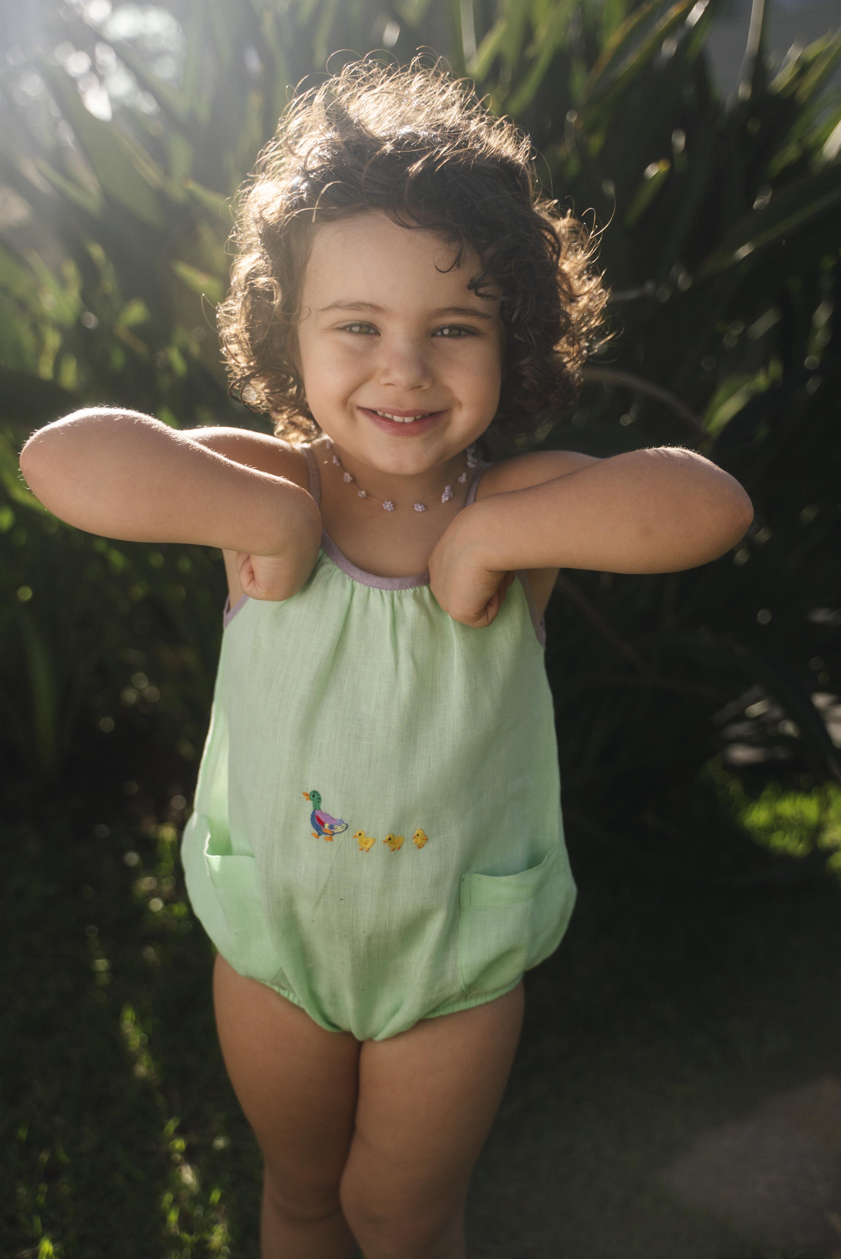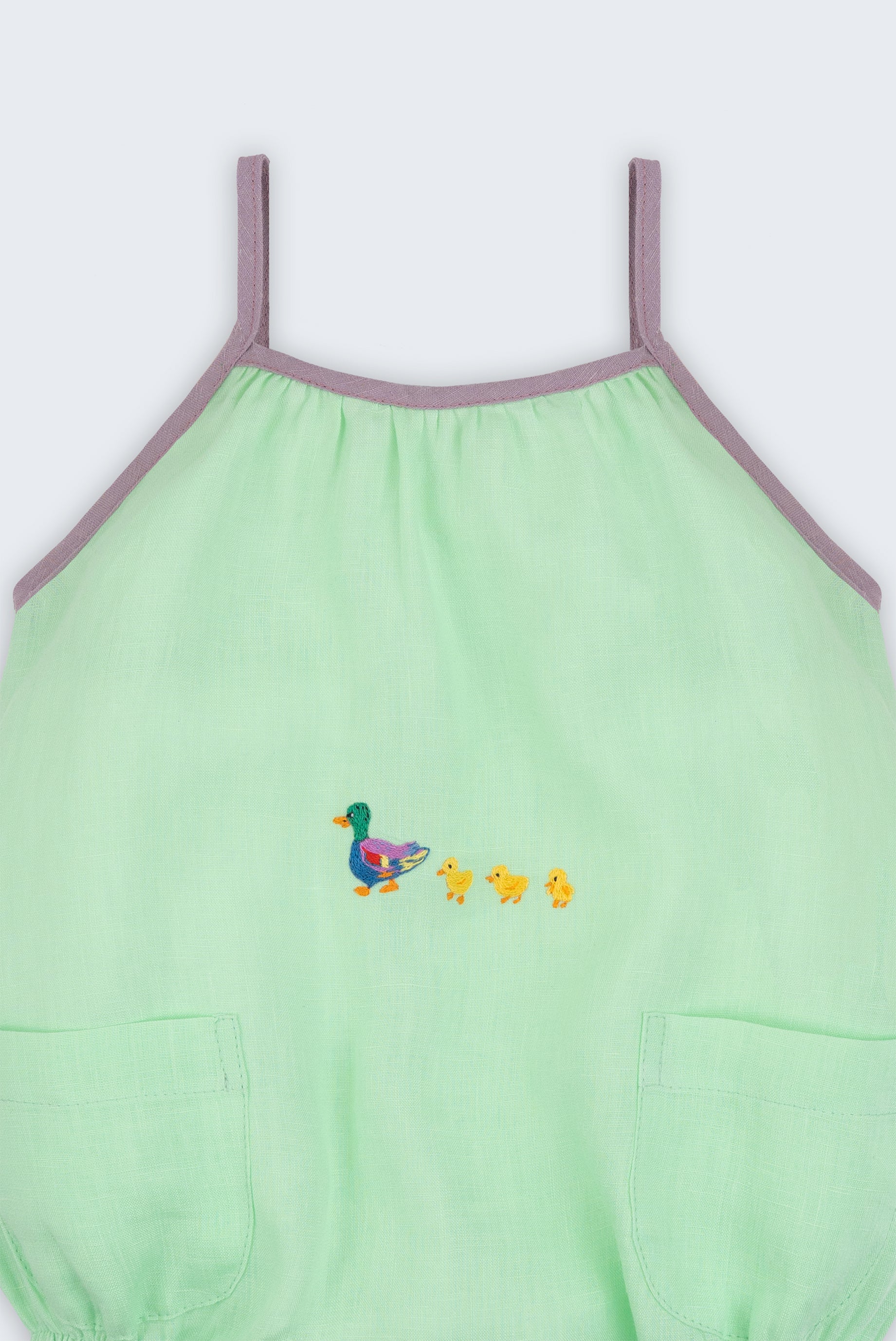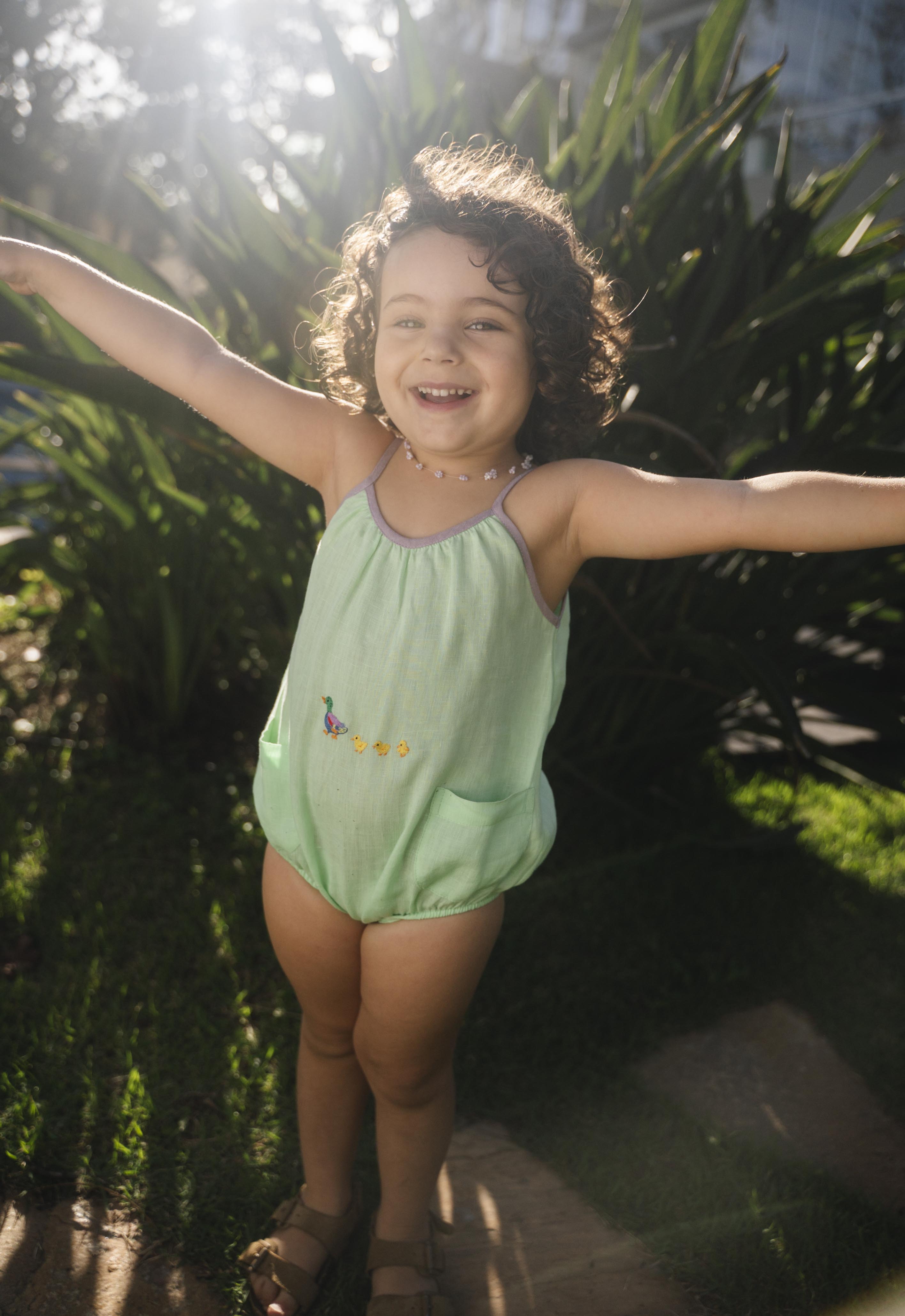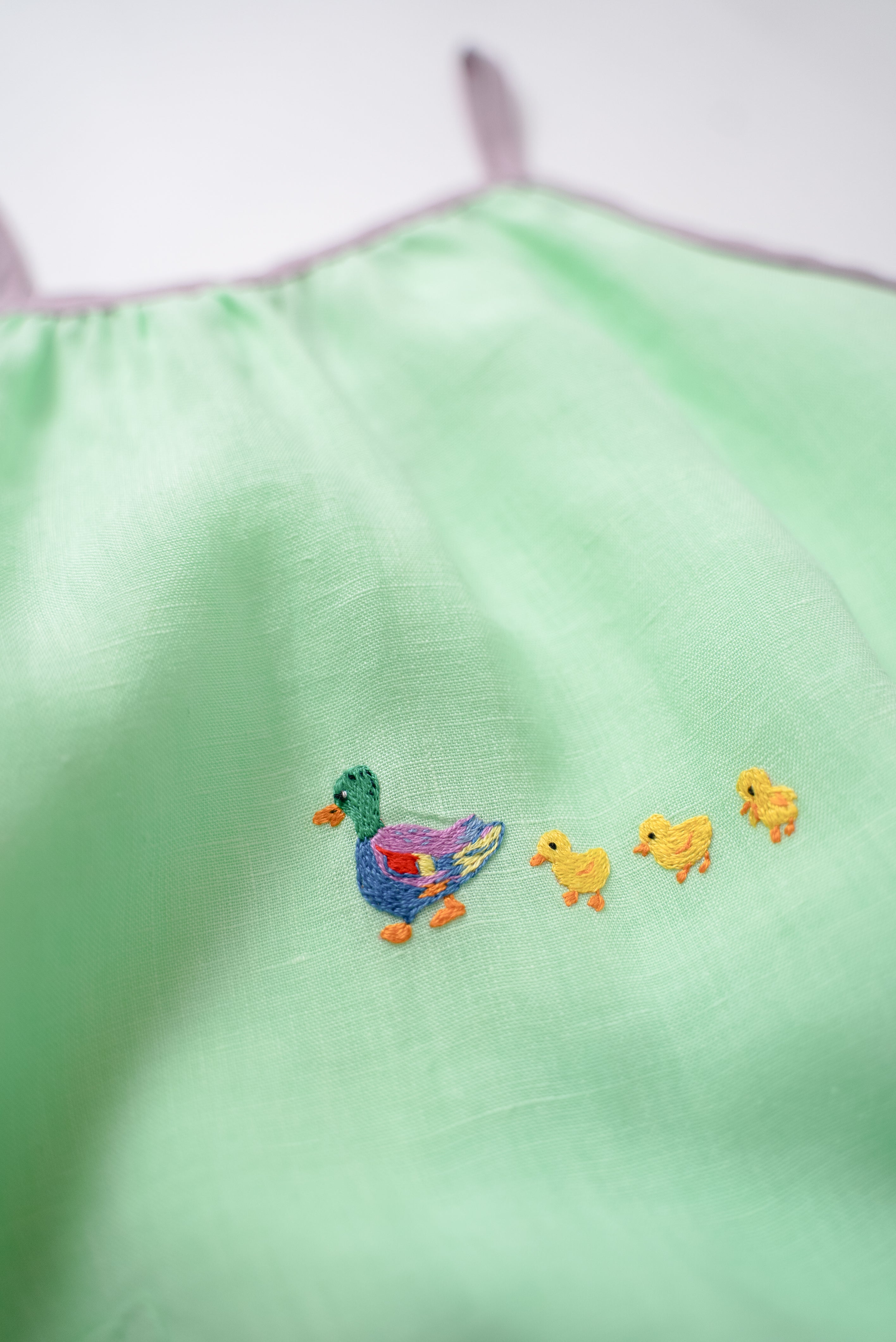 Este macaquinho de alças finas é leve, arejado e perfeito para os dias quentes — conforto garantido para meninos e meninas. O destaque é o bordado à mão de uma patinha e seus três patinhos, que passeiam pela frente da peça e trazem um toque lúdico e delicado.