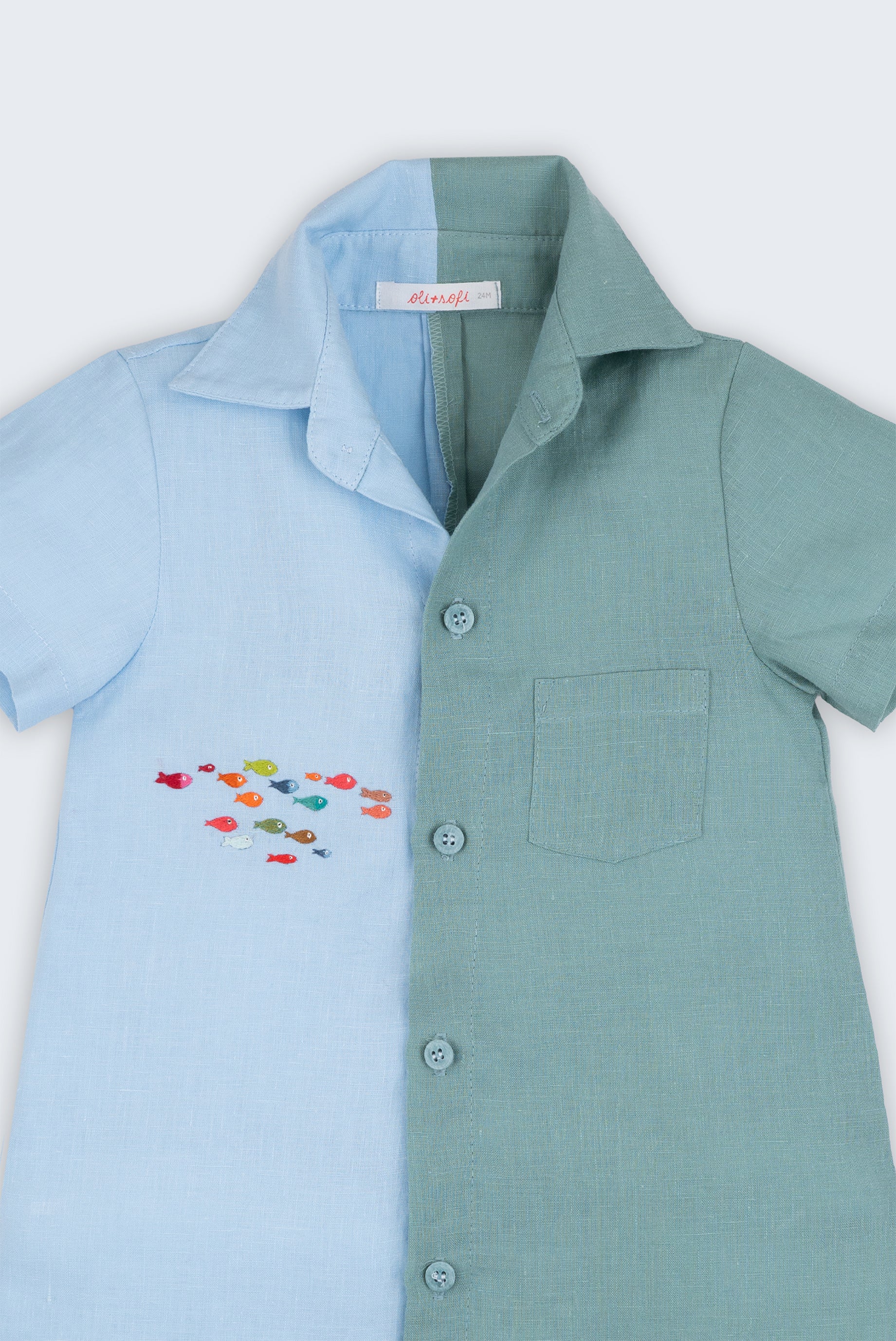 Macaquinho infantil em linho bicolor azul e verde com cardume de peixes bordado à mão, visto de frente em detalhe.