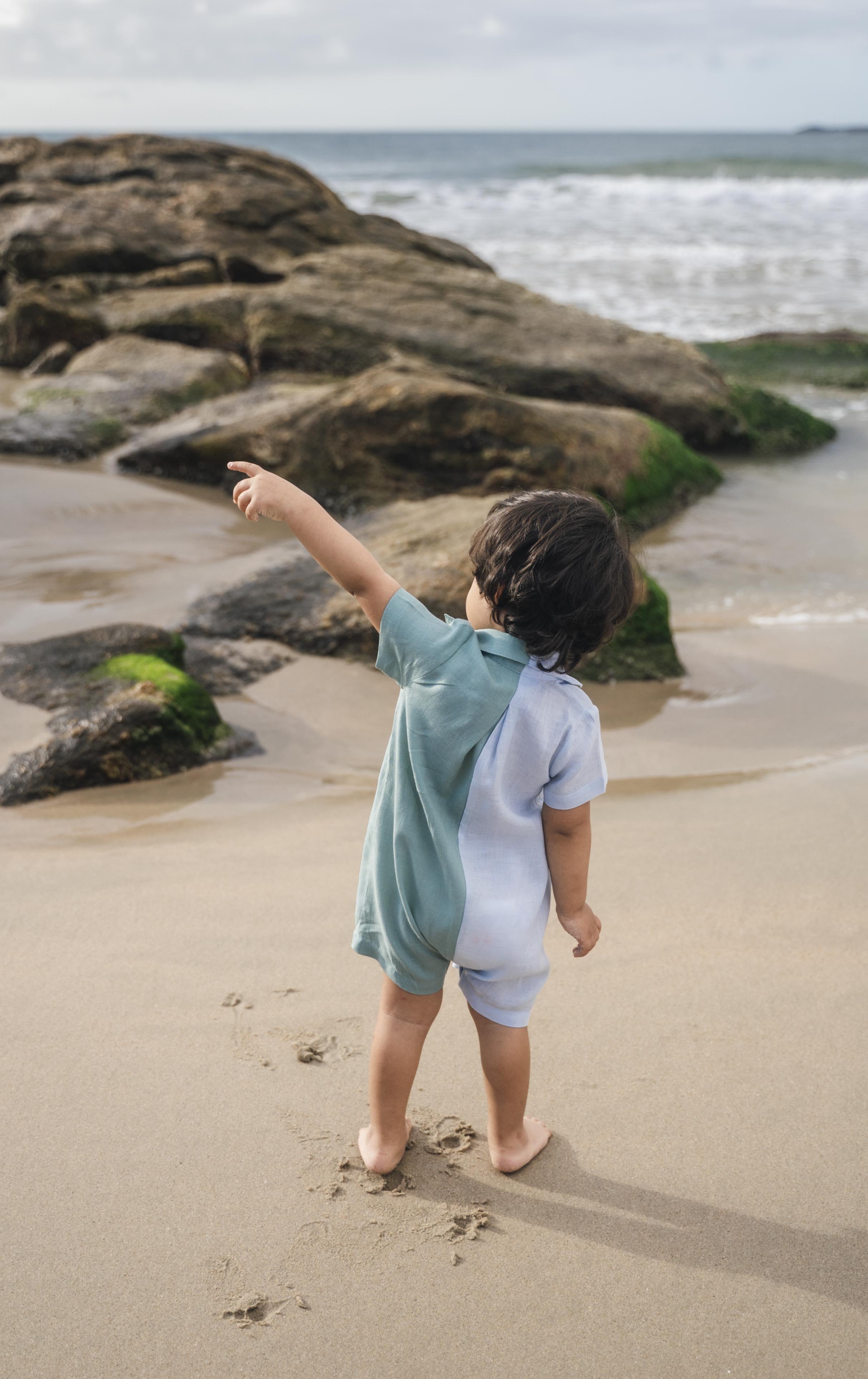 Menino de costas com macaquinho de linho bicolor azul e verde.