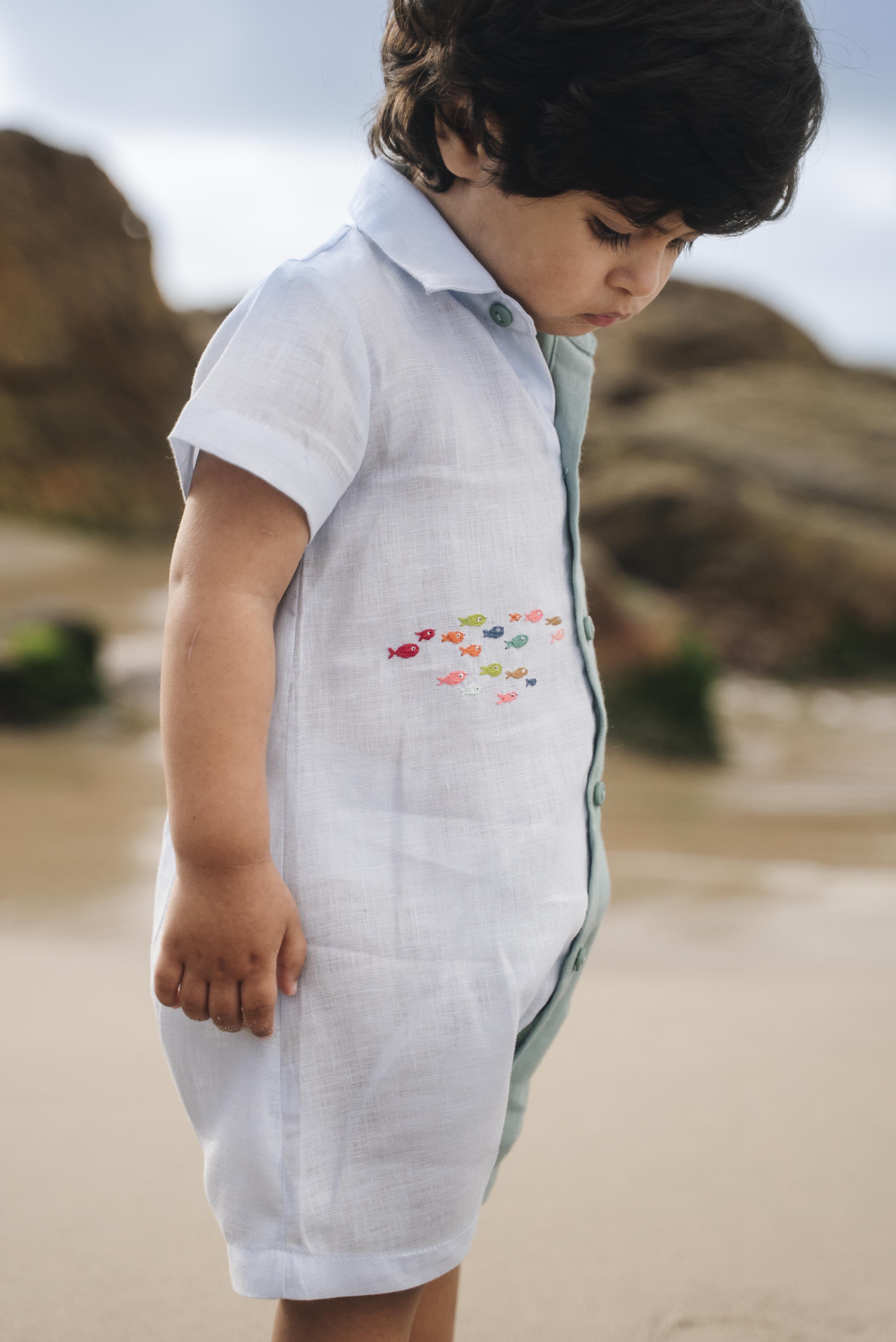 Este macaquinho bicolor nos tons azul-claro e verde-mar, tem caimento leve e toque fresco — conforto para meninos e meninas nos dias de sol. O destaque é o cardume de peixes bordado à mão, que atravessa a peça como quem nada em águas calmas.