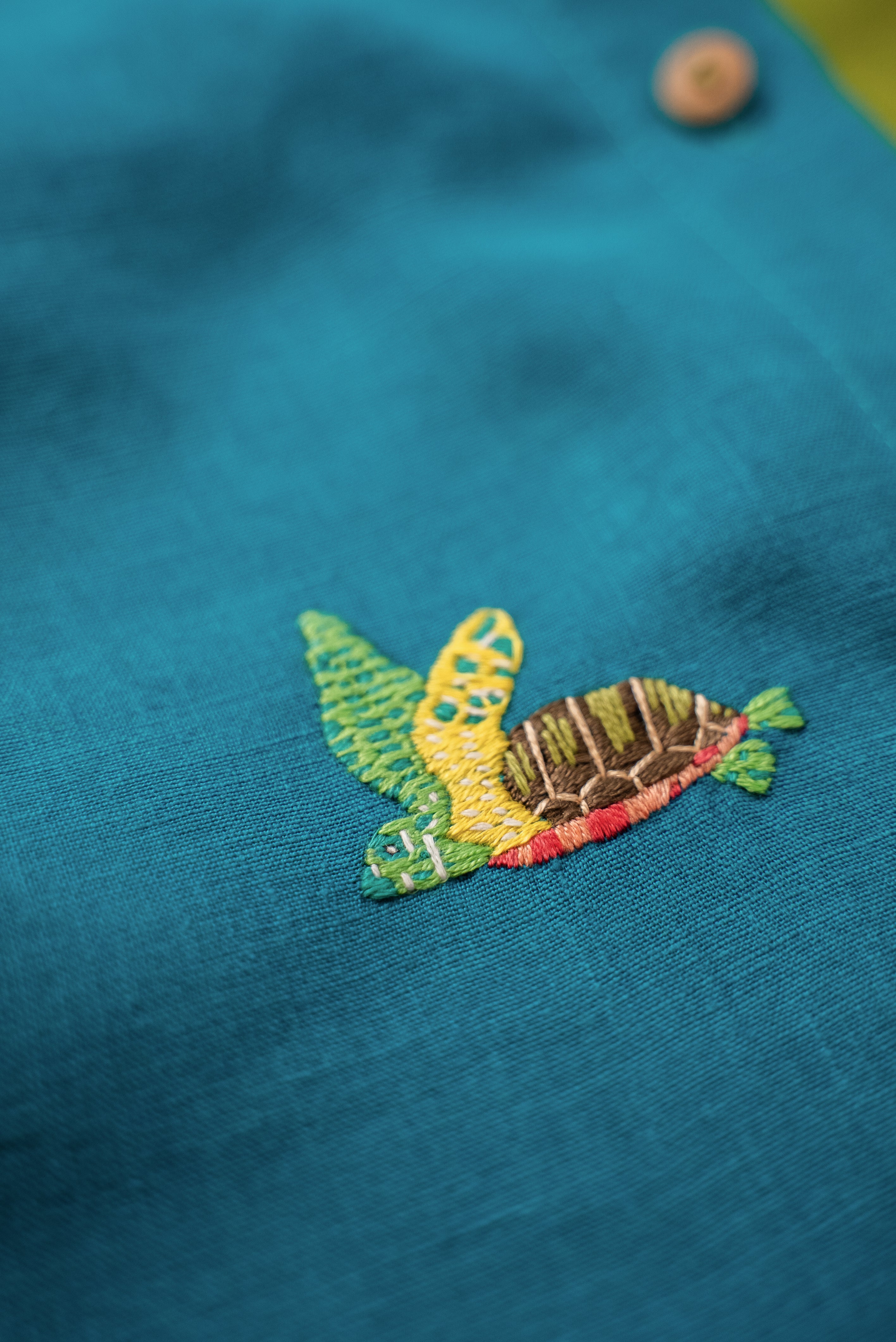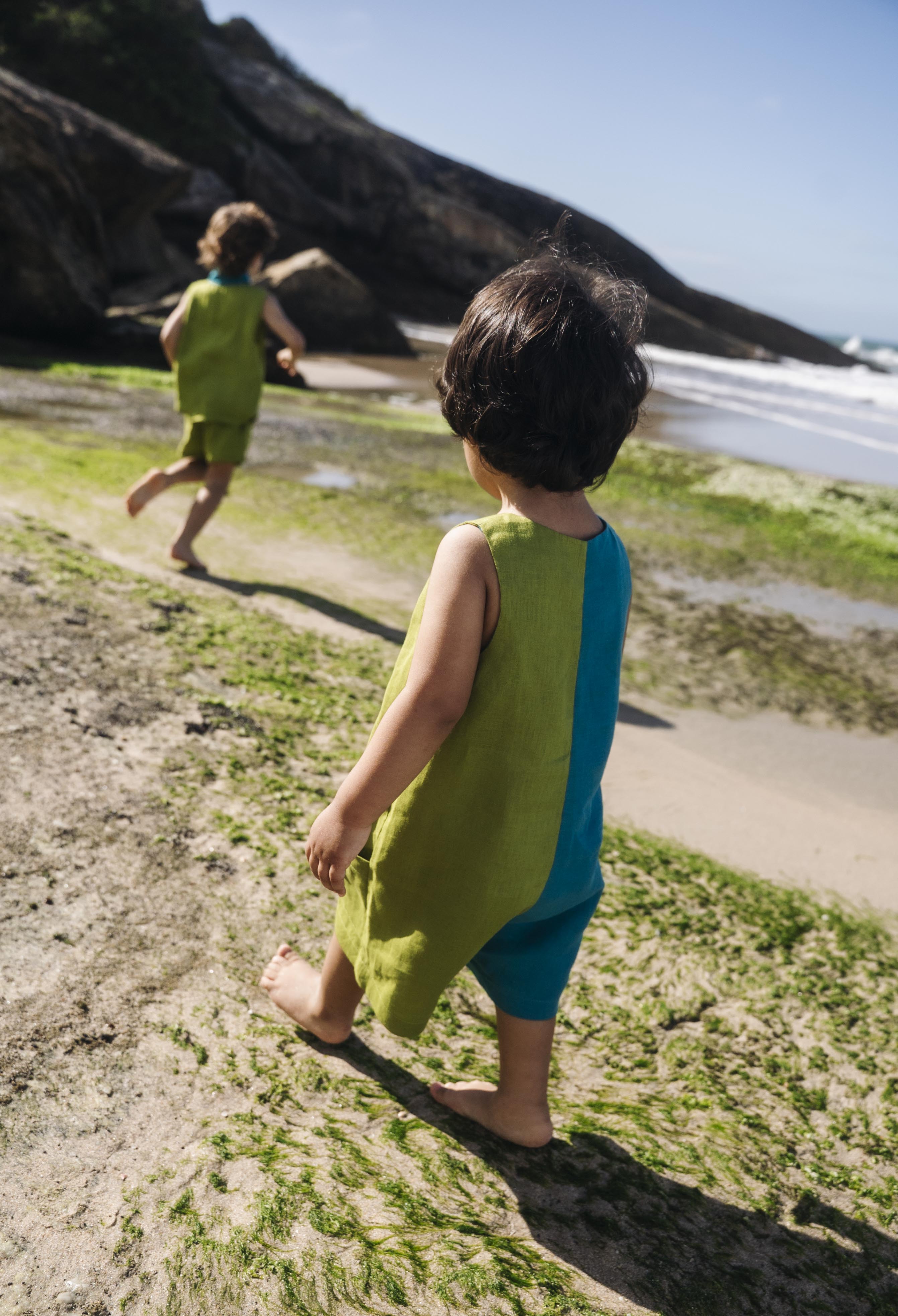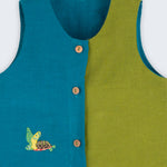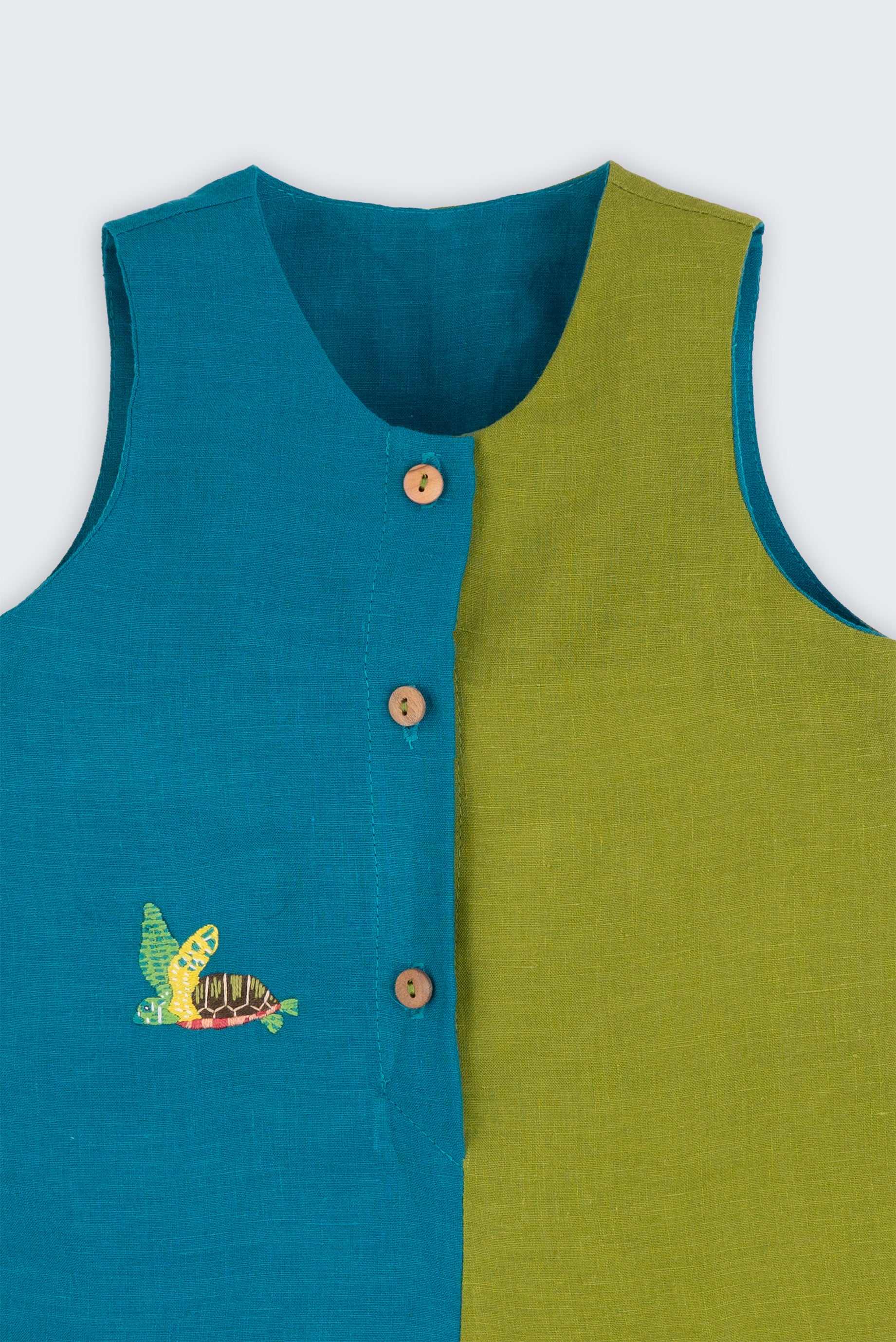 Macaquinho infantil de modelagem soltinha, bolsos laterais e botões frontais que facilitam o vestir. O design bicolor azul petróleo e verde cria um contraste alegre e original, e o charme fica por conta da tartaruga bordada à mão, pequeno símbolo de tempos gentis e de uma infância sem pressa.