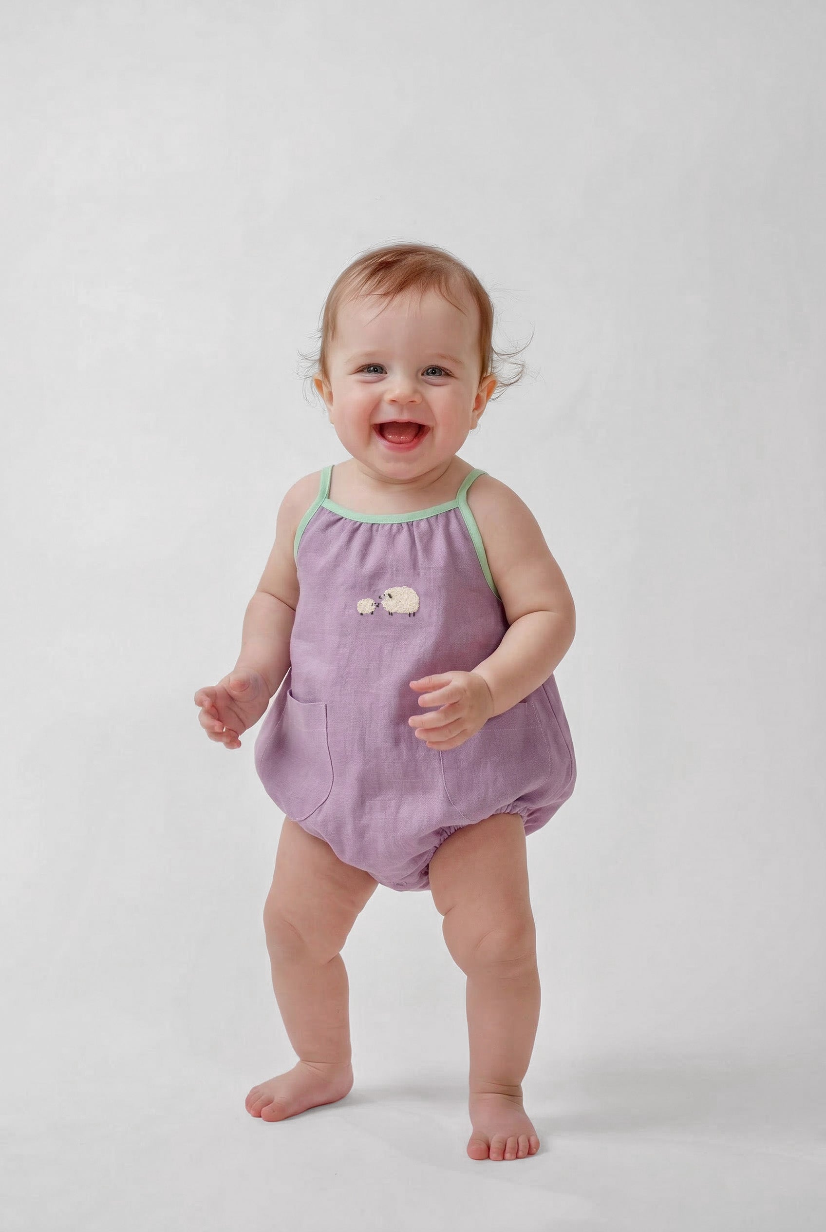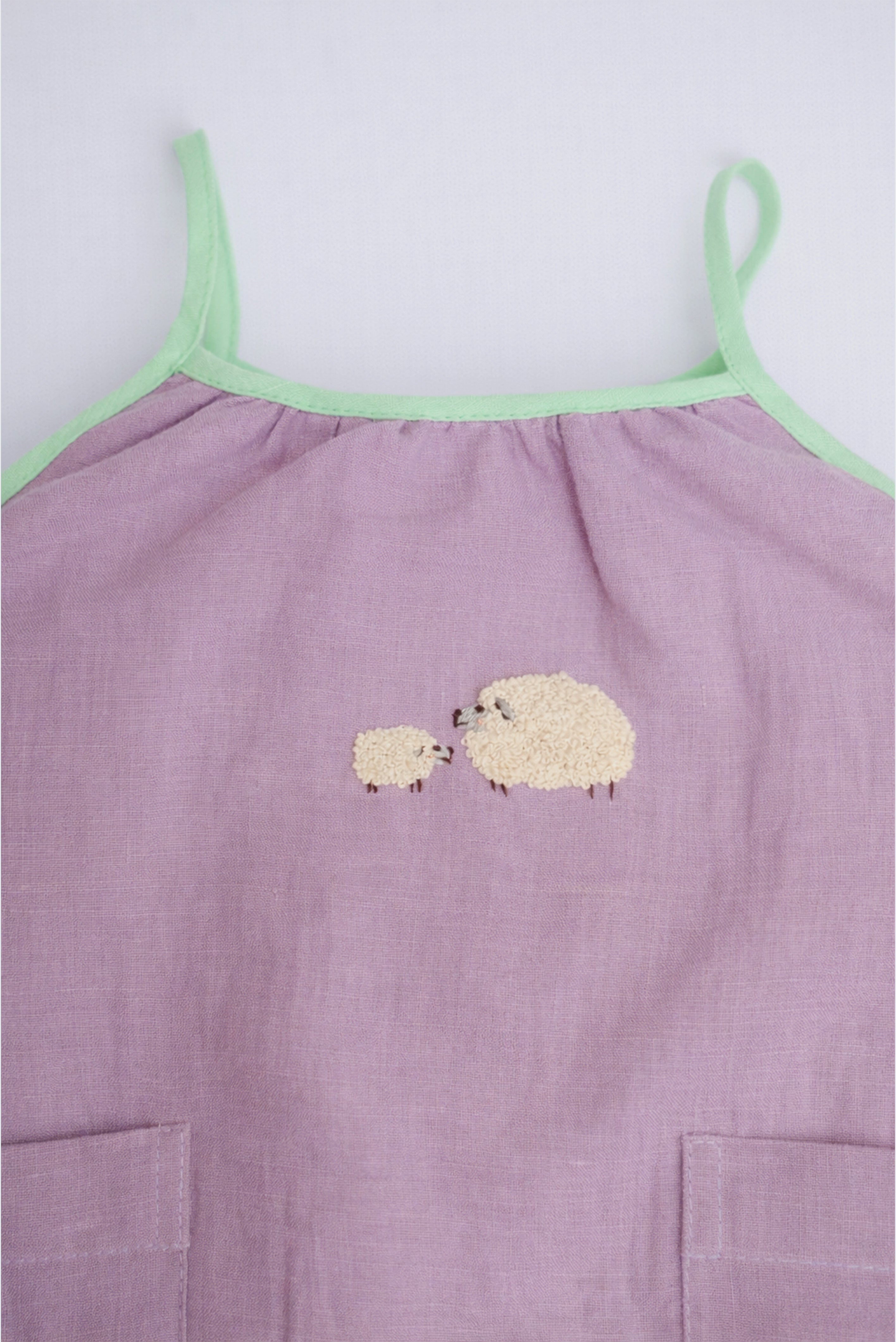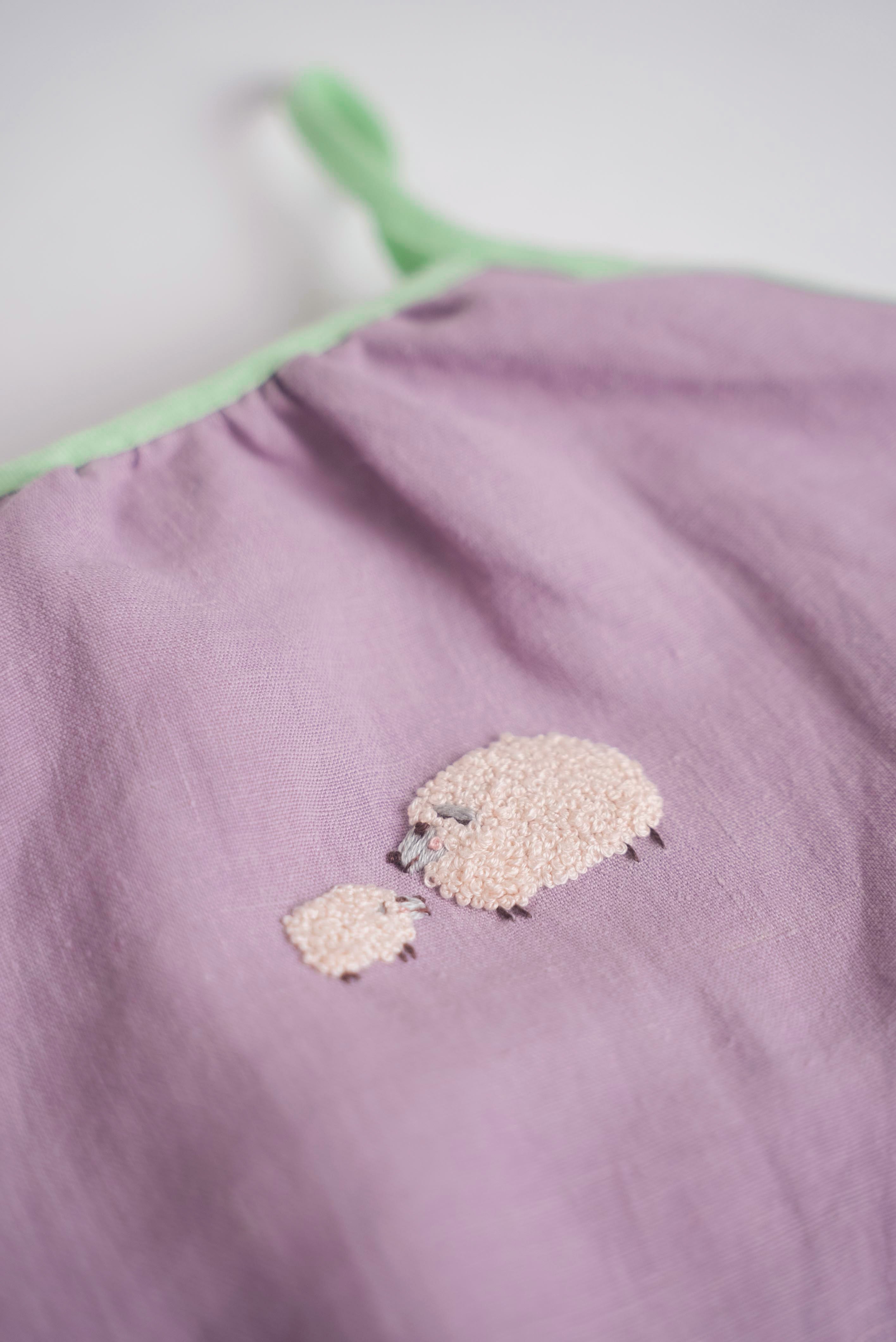 Confeccionado em 100% algodão, o tecido leve e respirável é ideal para a pele sensível dos bebês. O tom lilás suave ganha contraste com o acabamento em viés verde e um encantador bordado à mão de duas ovelhinhas, que parecem caminhar juntas pelo campo.