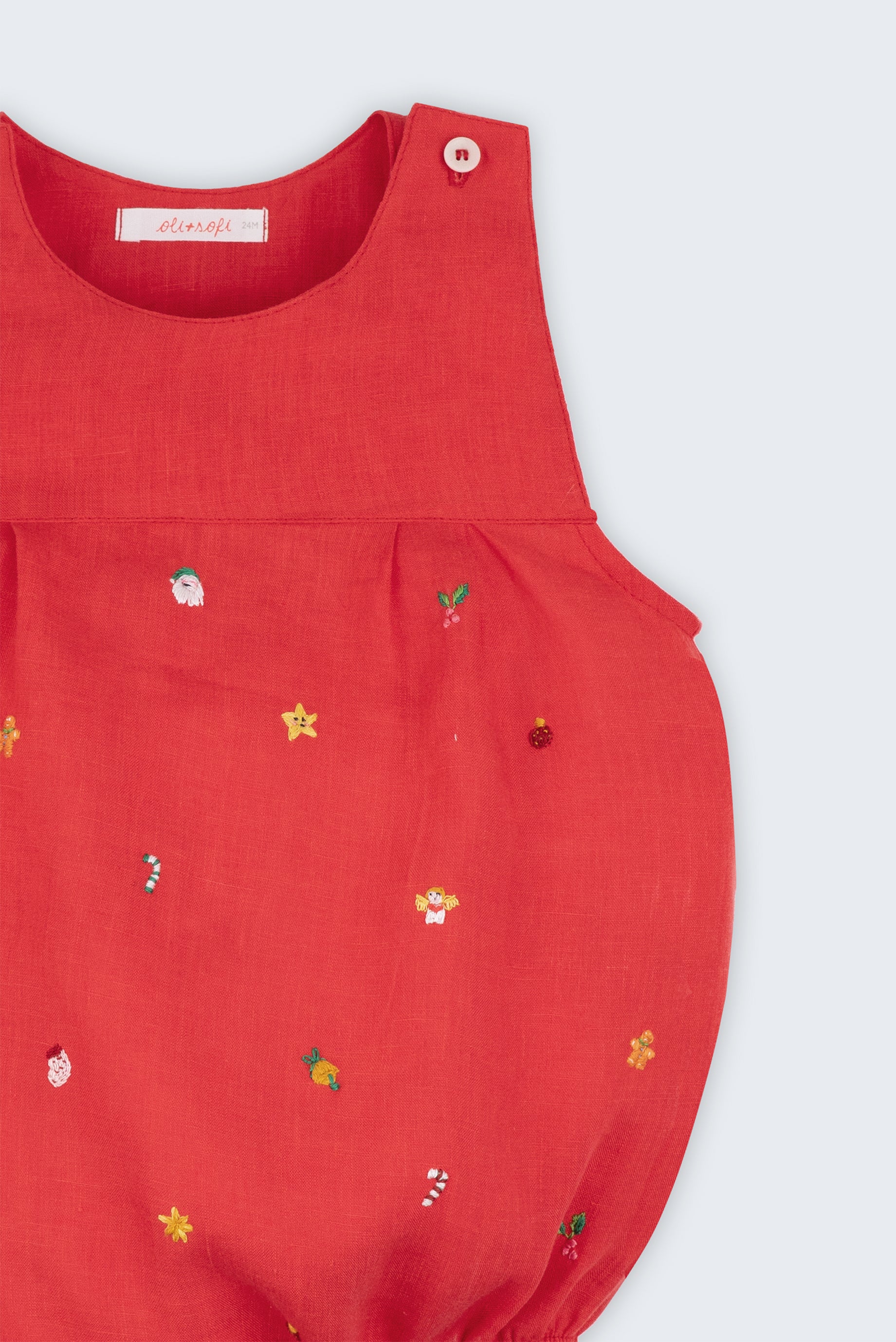 Feito em linho puro, é leve, fresco e confortável, ideal para os primeiros Natais do bebê. Cada ponto bordado carrega o tempo e o afeto das mãos artesãs, transformando a peça em uma lembrança afetiva — daquelas que guardam o cheirinho das festas e os risos da família reunida.