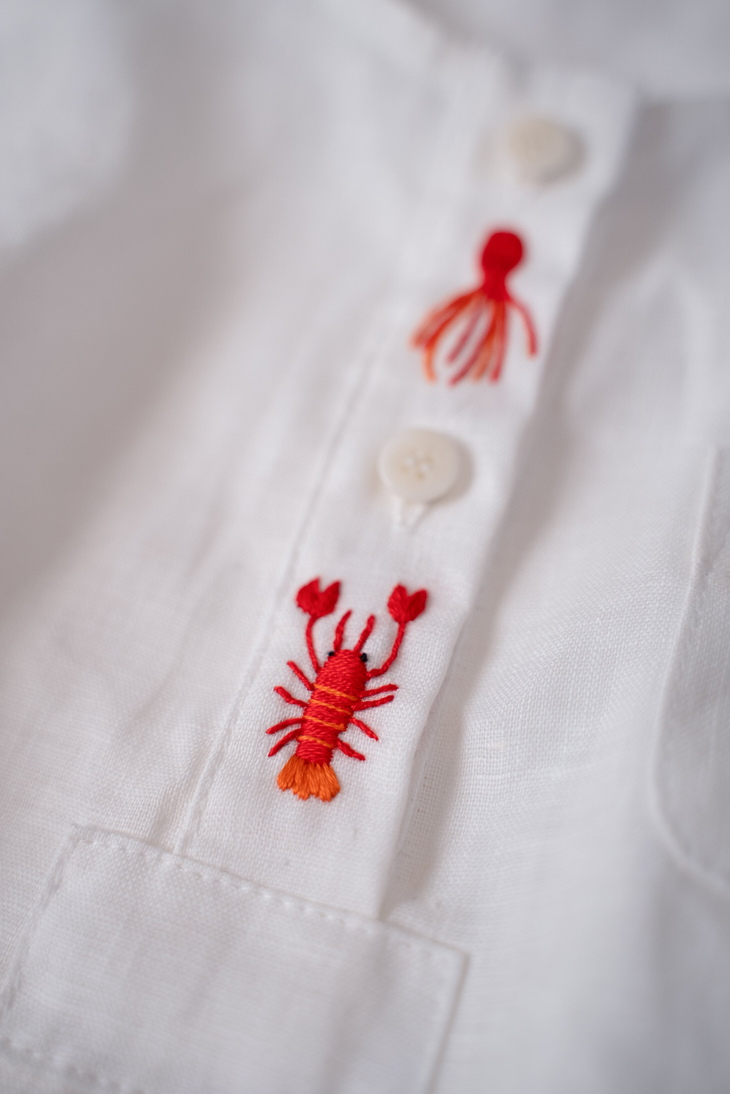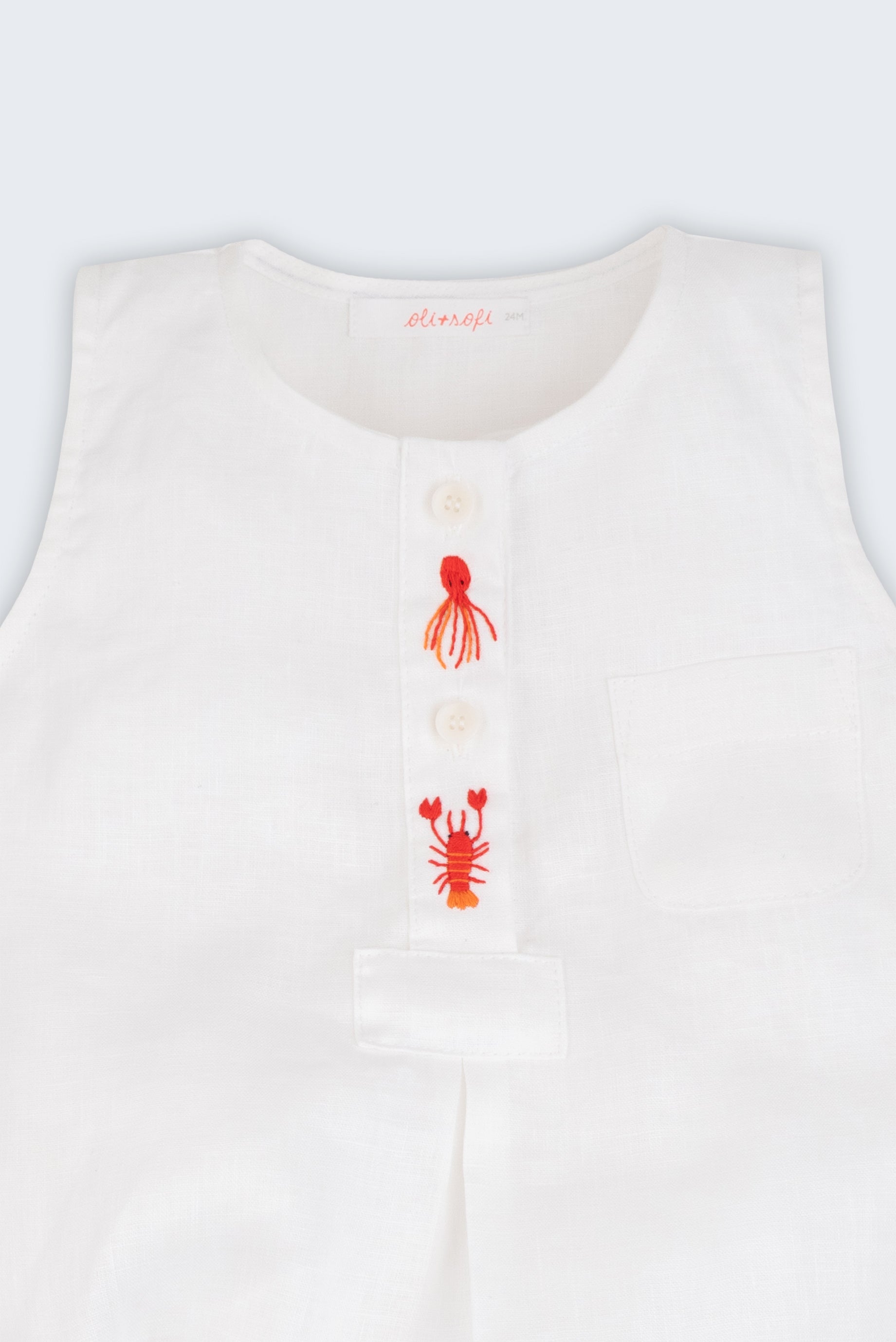 Com modelagem balonê e caimento leve, o macaquinho traz conforto e frescor para os dias de calor. O modelo conta com decote redondo, botões frontais e elástico nas pernas, garantindo liberdade de movimento sem apertar. O charme especial fica por conta dos bordados à mão de polvo e lagosta em tons de vermelho e laranja, que evocam o universo do fundo do mar.
