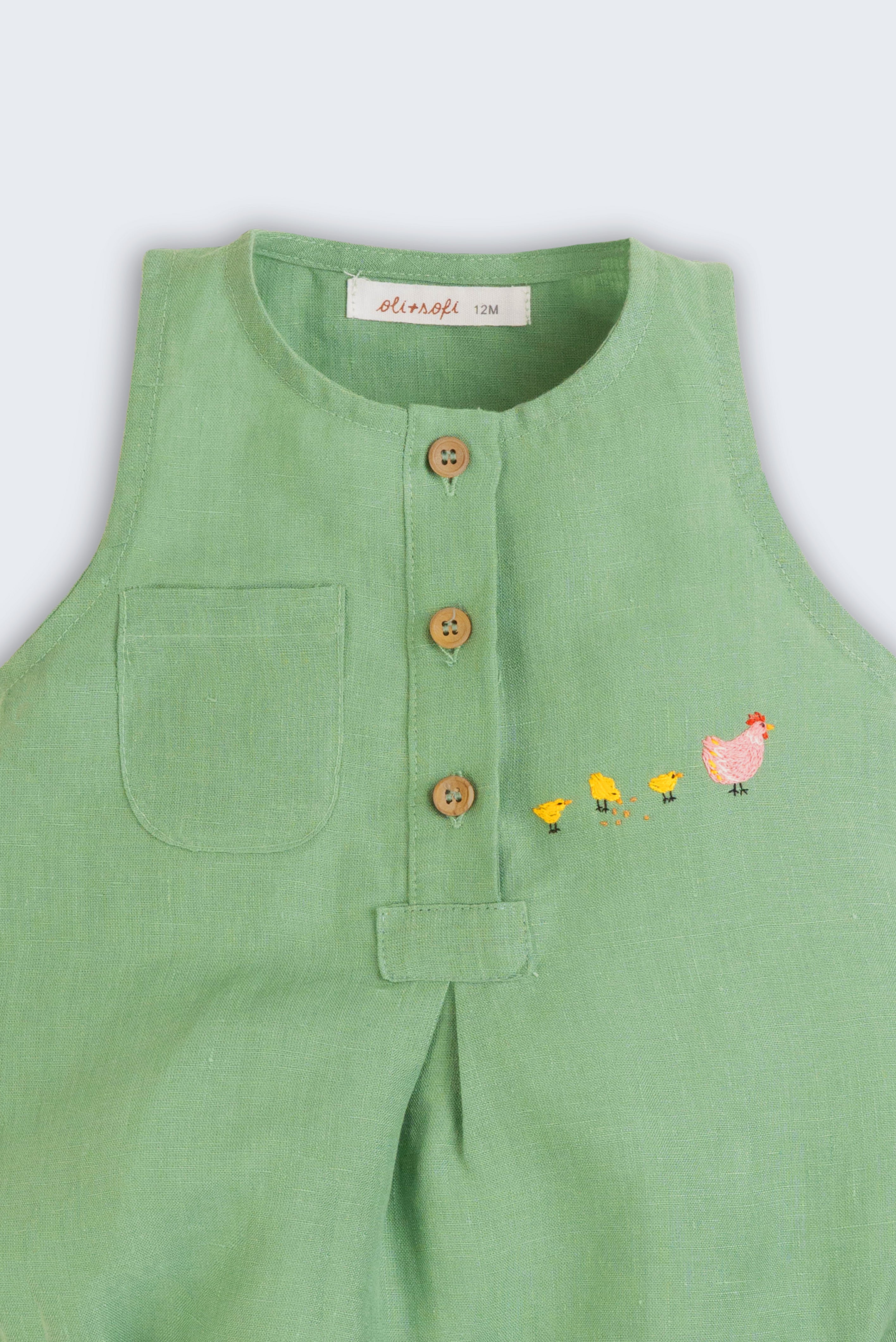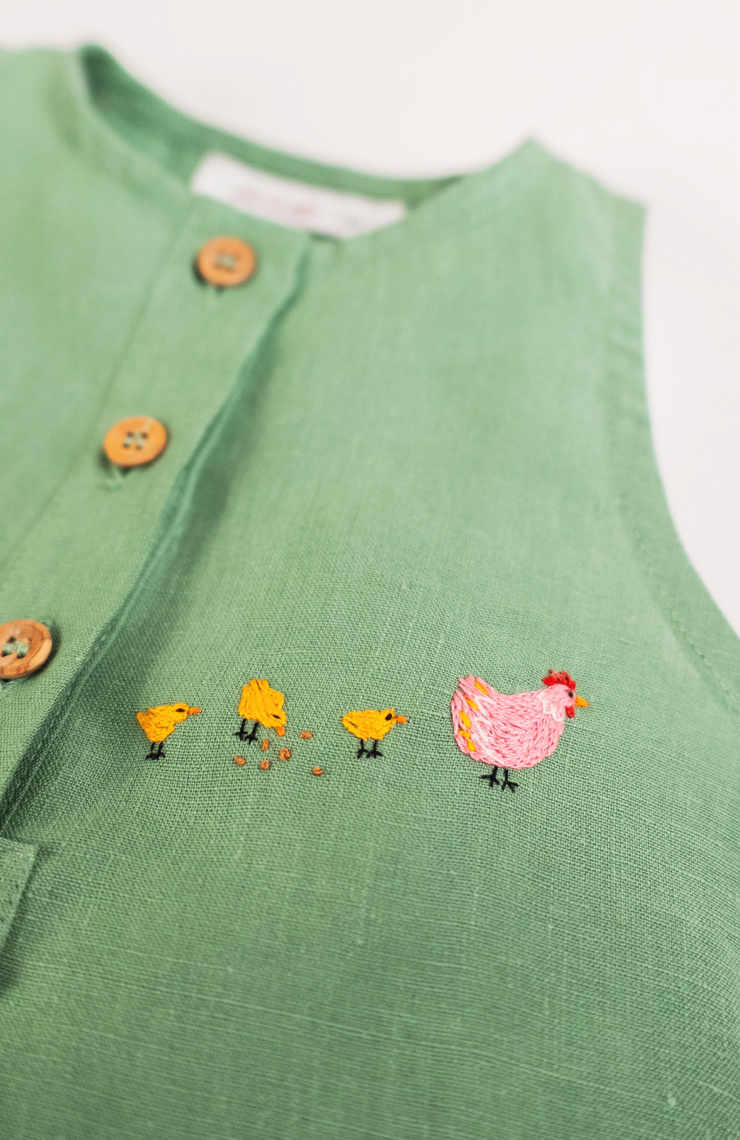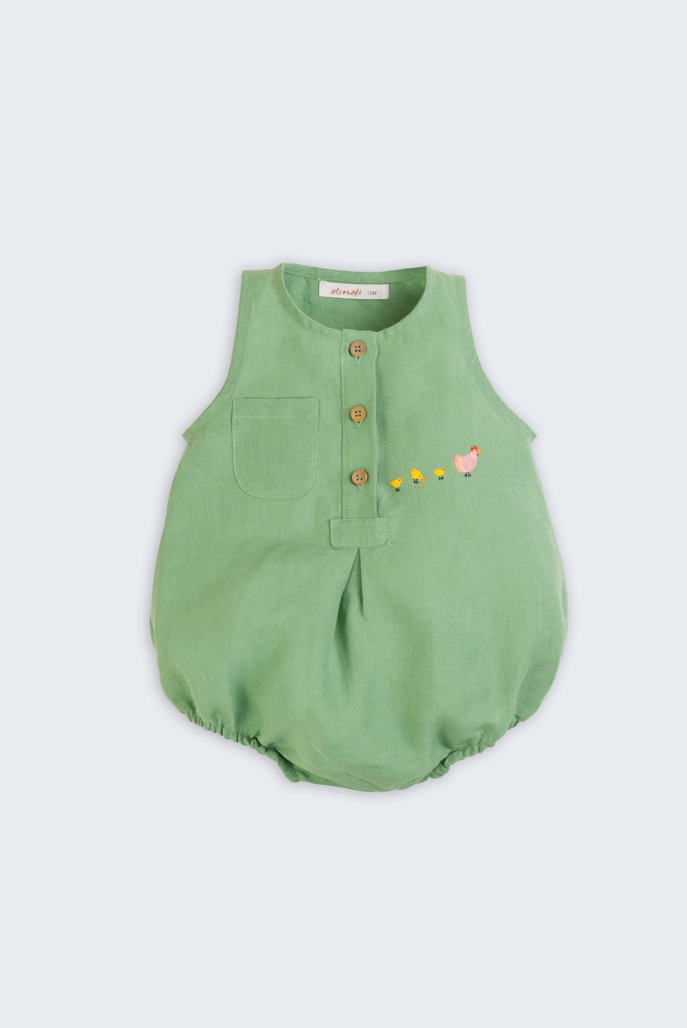 Macaquinho Valen Bebê em Linho Verde com Bordado de Galinha e Pintinhos