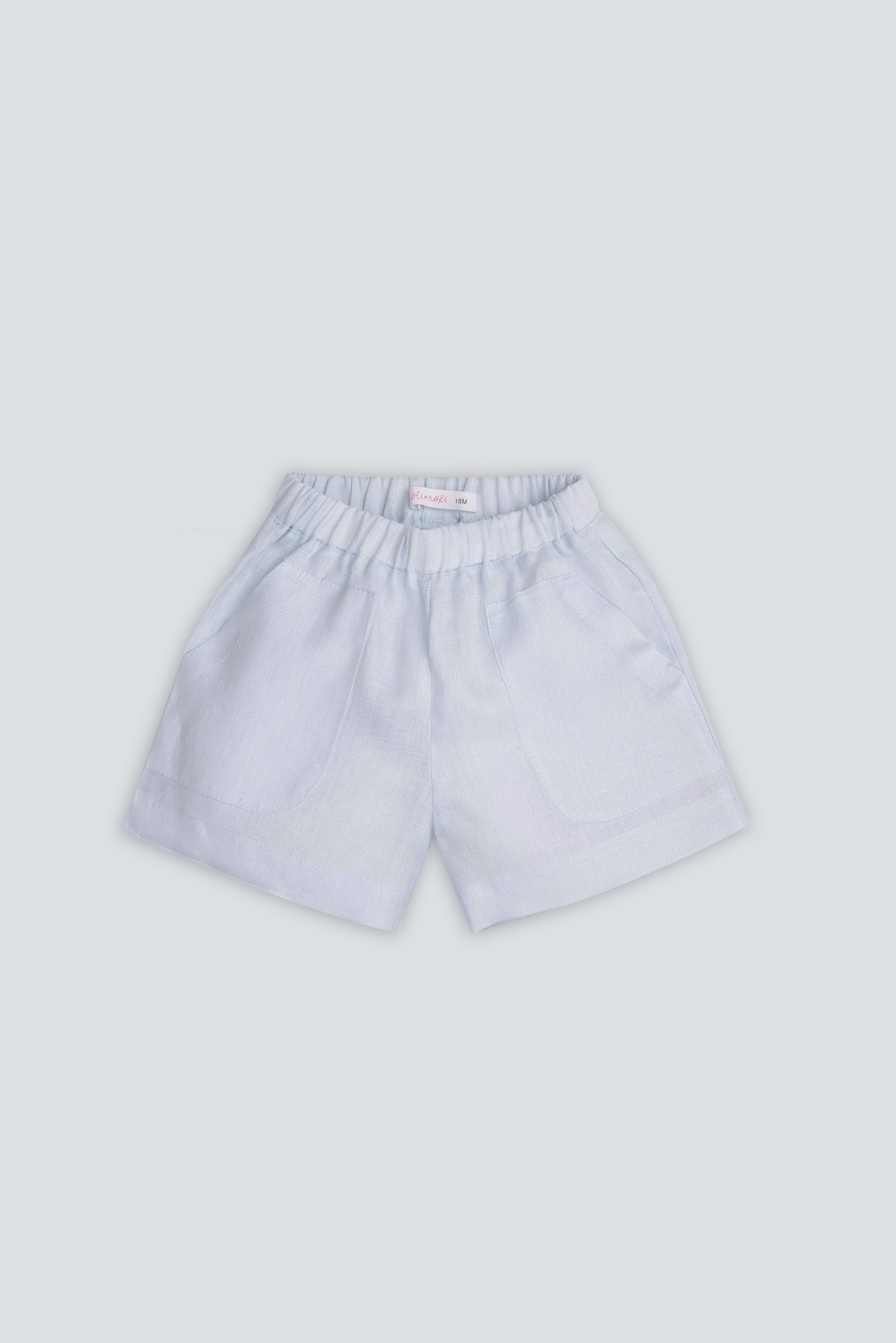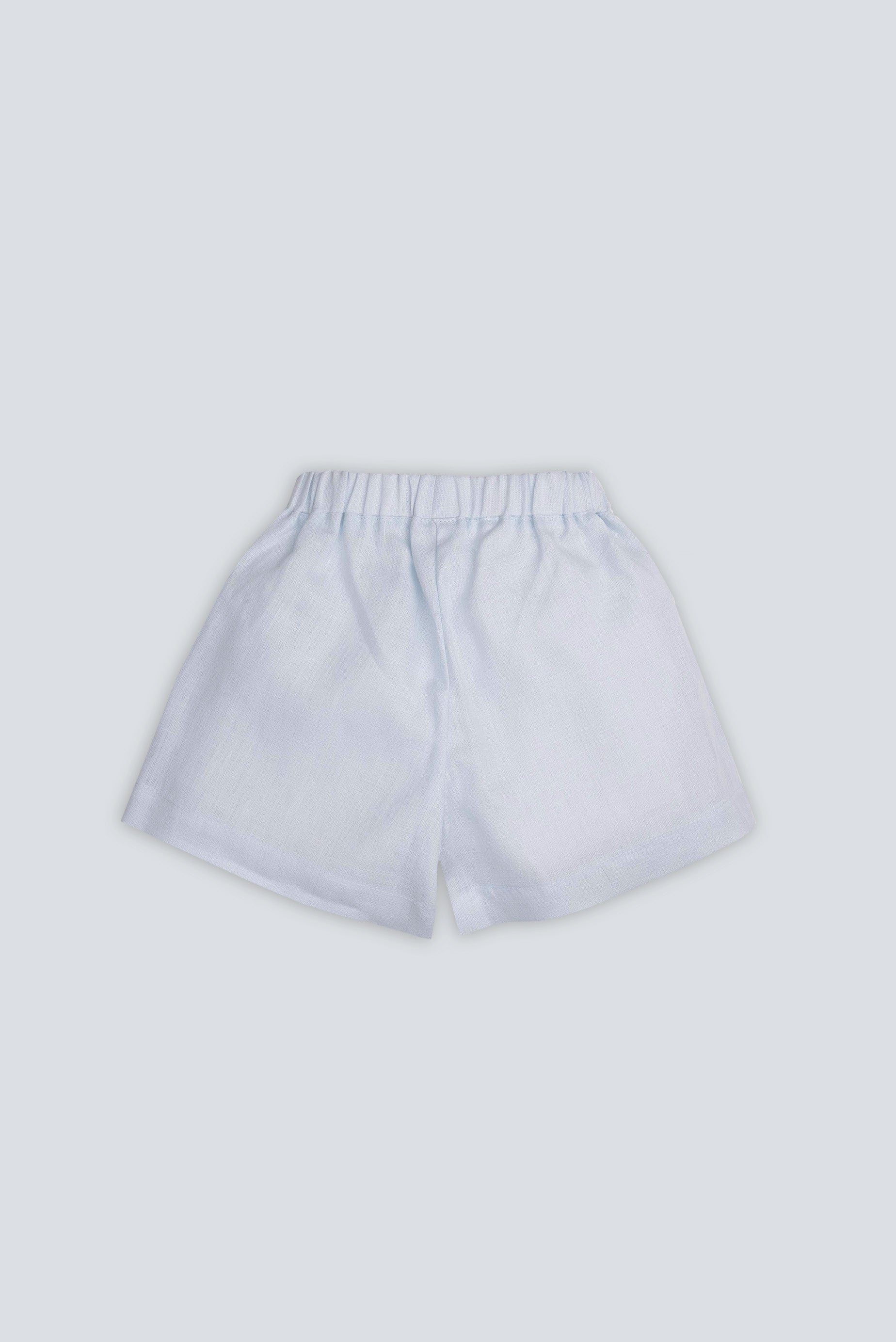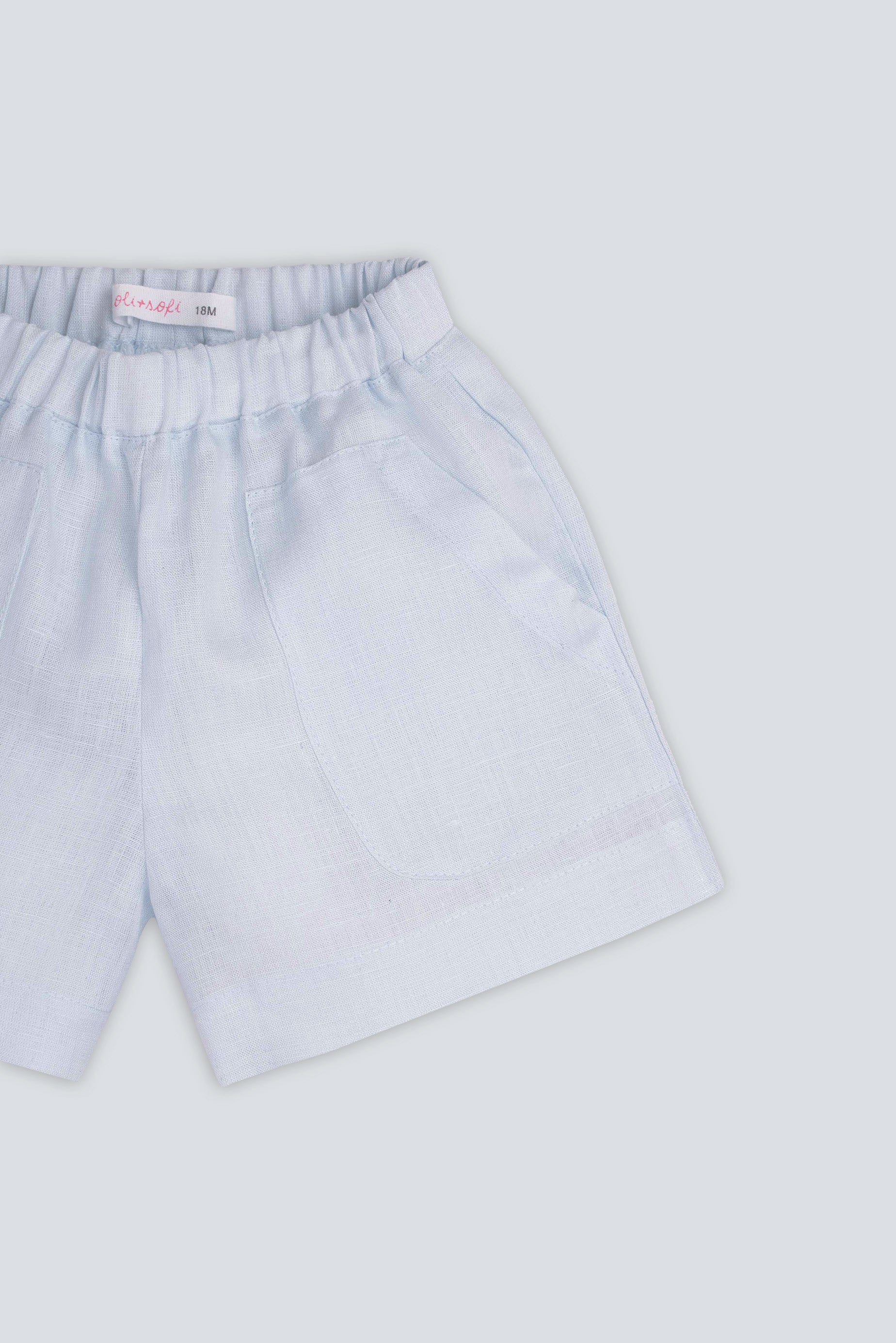 Shorts em puro linho na cor azul bebê, soltinho, com cós de elástico e bolsos laterais. Combine com a Camisa Tom Jacaré para um look cheio de charme.