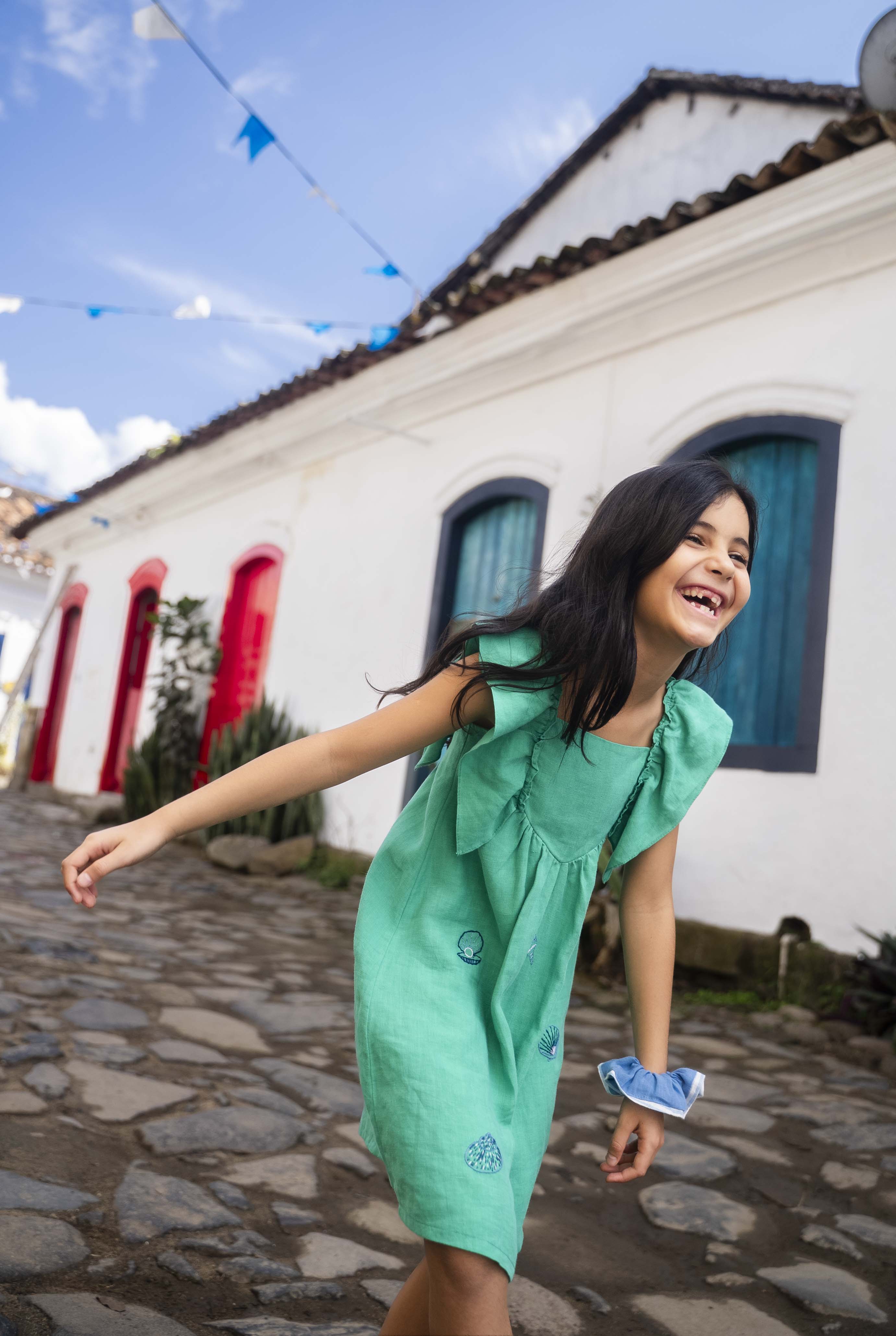 Criado para meninas que merecem liberdade de movimento e beleza natural. Um vestido versátil para passear, brincar ou celebrar momentos especiais em família.
