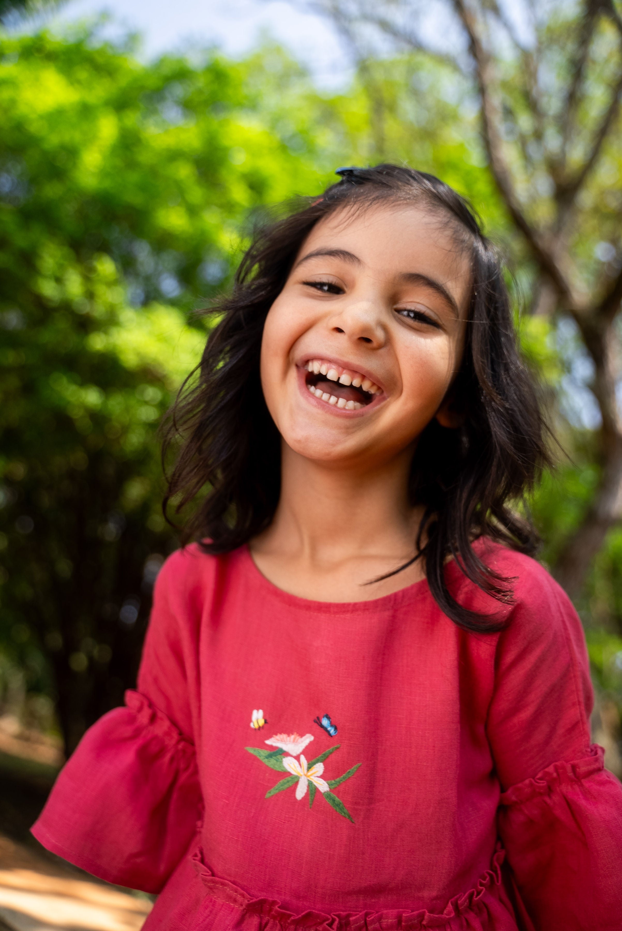 Possui generosa manga três quartos, com babado que dialoga com o drapeado da saia, um verdadeiro charme. Cada peça é cuidadosamente bordada à mão por artesãs locais, garantindo uma qualidade única e incomparável.